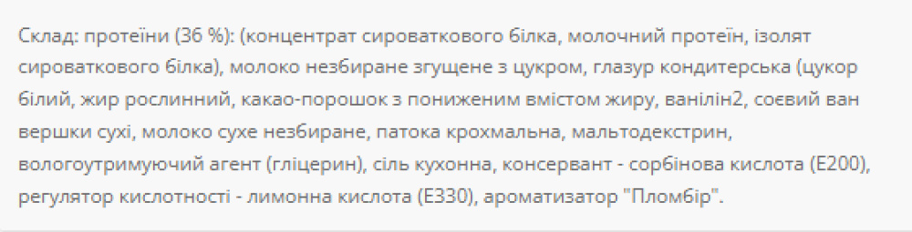 Завдяки високому вмісту білка, цей батончик стане ідеальним перекушуванням для тих, хто прагне підтримувати своє здоров'я та форму! Він забезпечує надзвичайно високий вміст білка – 36%, що є ідеальним перекусом. Цей батончик нагадує вам про неперевершену свіжість морозива або молочного ванільного коктейлю. Ви будете перенесені до літнього дитинства, коли ви насолоджувалися крижаним десертом із великим задоволенням. Ніжний і кремовий смак пломбірної гармонійно поєднується з чорною глазур'ю кондитерською, створюючи неперевершену симфонію смаків! Спробуйте його та відчуйте задоволення від кожного шматочка!