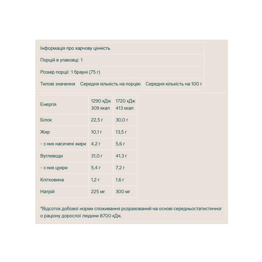 Зроблене з кращим какао з додаванням крихти з шоколаду преміальної якості, наш протеїновий брауні є нашим останнім поповненням у лінійці наших високобілкових закусок. Ви не зможете встояти перед його "шоколадністю" і тим, як воно приємно жується! Неможливо повірити, але факт – у кожному брауні міститься 23 гр протеїну та лише 4 гр цукру. Ця випічка, що тане в роті, містить на 75 з лишком відсотків менше цукру, ніж звичайні тістечка з супермаркету, так чого ж ви чекаєте? Вирішуйте, ви можете дозволити собі цю смакоту, не відчуваючи вини за те, що об'їлися солодким! Щоб дійсно отримати задоволення, чому б не скуштувати одне з наших тістечок з нашими десертними сиропами без цукру – MySyrupTM, та нашою чудовою арахісовою пастою. Високий вміст білка в протеїновому брауні сприятиме зростанню та підтримці сухої м'язової маси. Порція - 1 Тістечко (75g) Nutritional Information В 100 гр У 75 гр Energie 1600 кДж/383 ккалl 1200 кДж/287 ккал Grasimi 13 гр 9.7 з яких насичених 5.7 гр 4 гр 4 5 гр 5 2.7 гр 2 гр Протеїн 30 гр 23 гр Сіль 0.4 гр 0.3 гр
