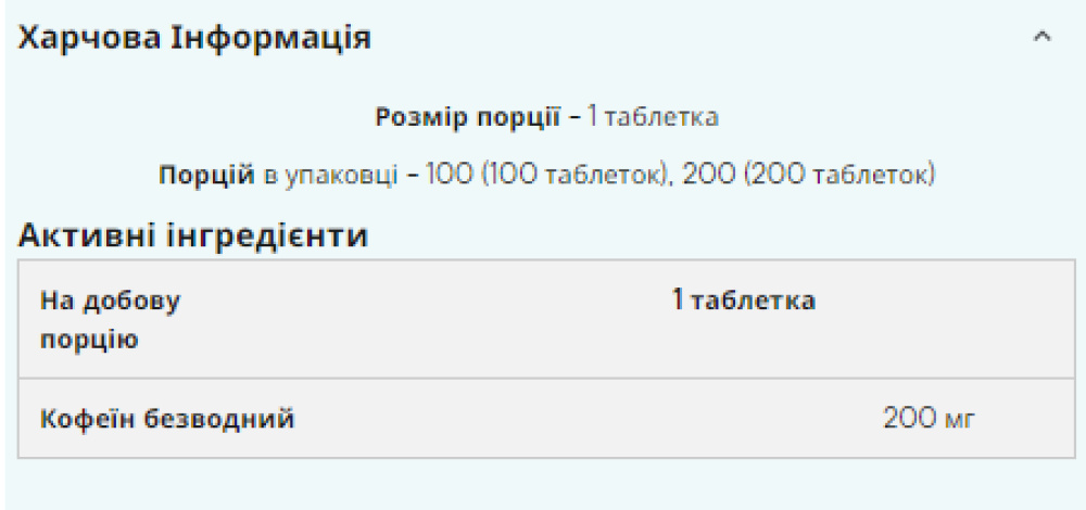 Ми рекомендуємо приймати 1 таблетку (200 мг) за 30-60 хвилин до тренування. Не приймайте більше 1 таблетки за 1 годину або 2 таблетки за 24 години.