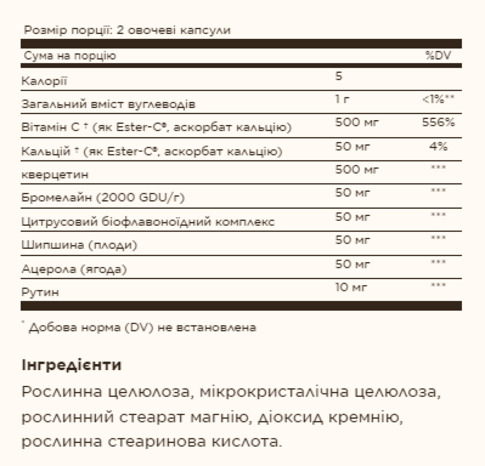 Solgar® Quercetin Complex містить важливий біофлавоноїд кверцетин у синергетичній формулі з Ester-C® Plus для забезпечення унікальних антиоксидантів, а також підтримки імунної системи. Кверцетин міститься в цибулі та інших продуктах. Це корисно для здоров’я та гарного самопочуття. Ester-C® Plus забезпечує унікальну рН-нейтральну (некислотну) форму вітаміну С, яка щадить шлунок. Ester-C® Plus пропонує додаткові переваги включення ягід ацероли, цитрусових біофлавоноїдів, рутину та плодів шипшини. Ця формула також містить бромелайн, фермент, отриманий з ананаса.