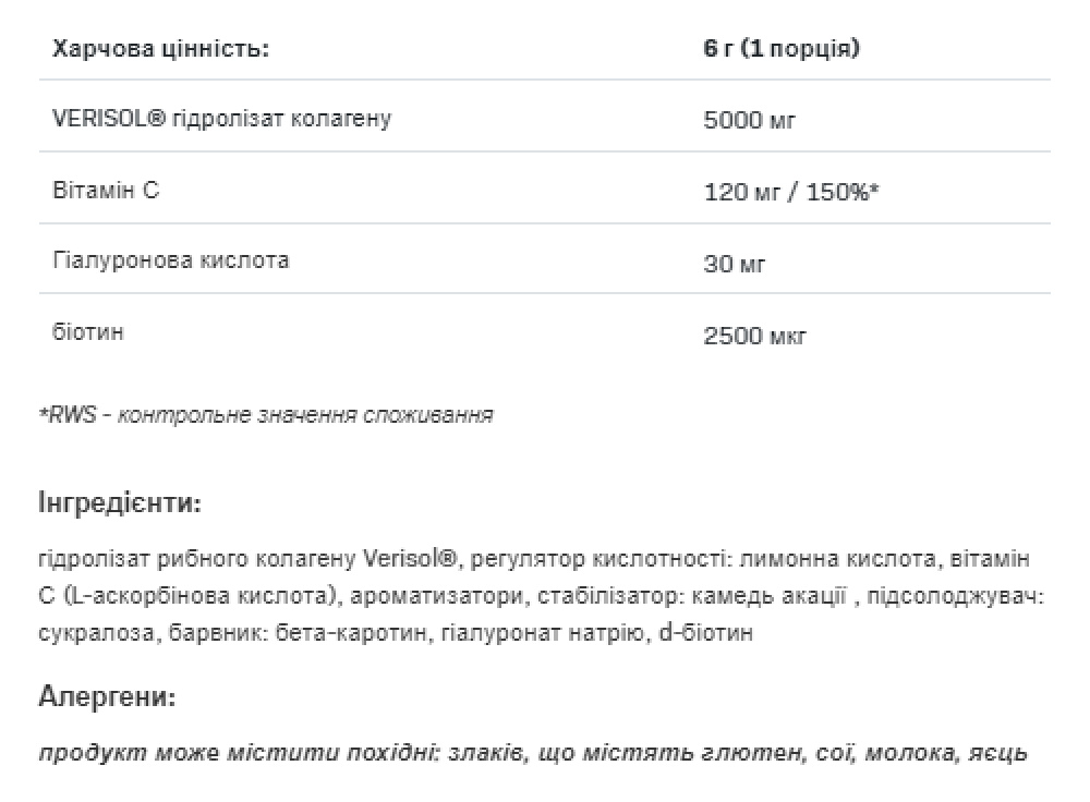 COLLAROSE FISH содержит гидролизат рыбьего коллагена VERISOL, запатентованный и производимый немецкой фармацевтической компанией GELITA, который влияет на выработку коллагена изнутри, создавая новые коллагеновые волокна по всей коже, особенно на лице.