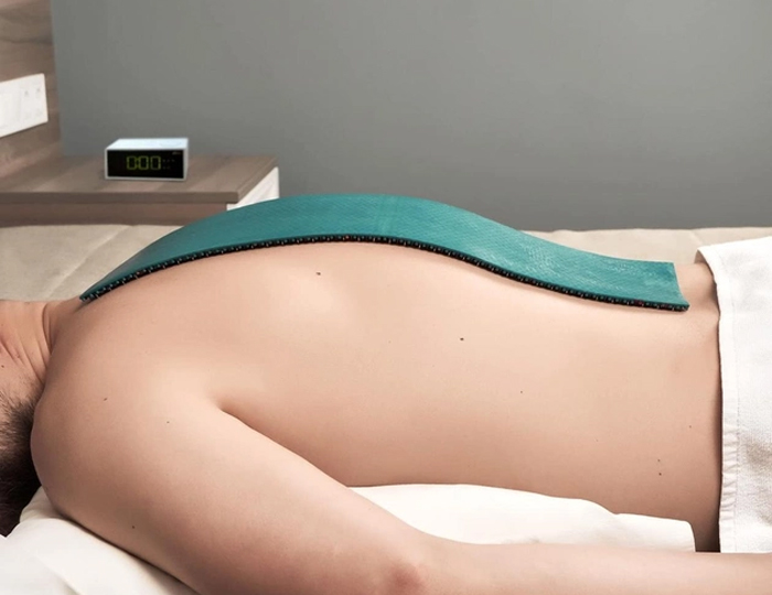 Затем пользователю необходимо лечь на коврик так, чтобы иглы плотно соприкасались с поверхностью кожи.