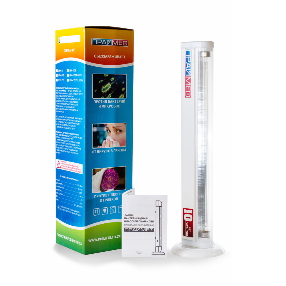Бактерицидная лампа Праймед ЛБК-150 является классическим напольным изделием, защищающим помещение от вирусов, микробов и бактерий. Согласно исследованиям, она убивает 99% вирусов не только в воздухе, но и на поверхностях, всего спустя 30 минут воздействия.