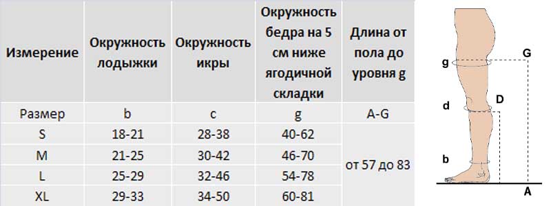 - физиологически распределенная градуированная компрессия: лодыжка 100%, середина икры 80%, колено 50-60%, верхняя треть бедра 20-30%