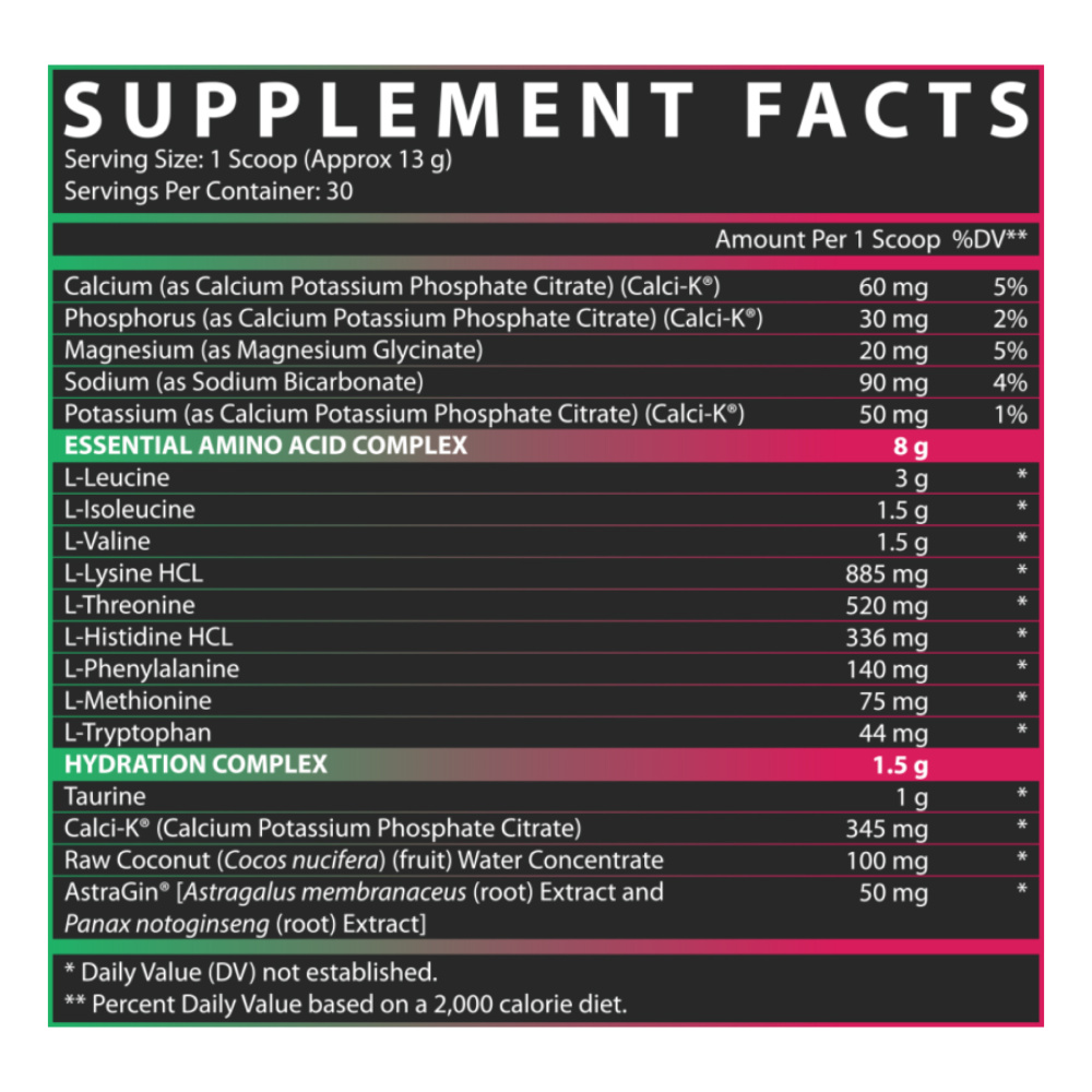 ДобавкаФакты Размер порции: 1 мерная ложка (около 13 г) Количество порций в упаковке: 30 Количество на порцию %DV Кальций (в виде цитрата фосфата кальция и калия) (Calci-K™) 60 мг 5% Фосфор (в виде цитрата фосфата кальция-калия) (Calci-K™) 30 мг 2% Магний (в виде глицината магния) 20 мг 5% Натрий (в виде бикарбоната натрия) 90 мг 4% Калий (в виде цитрата кальция фосфата калия) (Calci-K™) 50 мг 1% КОМПЛЕКС НЕЗАМЕНИМЫХ АМИНОКИСЛОТ 8 г L-лейцин 3 г * L-изолейцин 1,5 г * L-валин 1,5 г * L-лизин гидрохлорид 884,75 мг * L-треонин 520,05 мг * L-гистидин гидрохлорид 335,94 мг * L-фенилаланин 139,88 мг * L-метионин 75 мг * L-триптофан 44,38 мг * УВЛАЖНЯЮЩИЙ КОМПЛЕКС 1,5 г Таурин 1 г * Calci-K™ (цитрат фосфата кальция и калия) 345 мг * Сырой кокос ( Cocos nucifera) (фрукты ) Водный концентрат 100 мг * AstraGin™ [экстракт Astragalus membranaceus (корень) и экстракт Panax notoginseng (корень)] 50 мг * *Дневная норма (DV) не установлена. ДРУГИЕ ИНГРЕДИЕНТЫ: лимонная кислота, мальтодекстрин, натуральные и искусственные ароматизаторы, диоксид кремния, сукралоза. ПРЕДУПРЕЖДЕНИЕ О АЛЛЕРГЕНАХ: орехи (кокос).