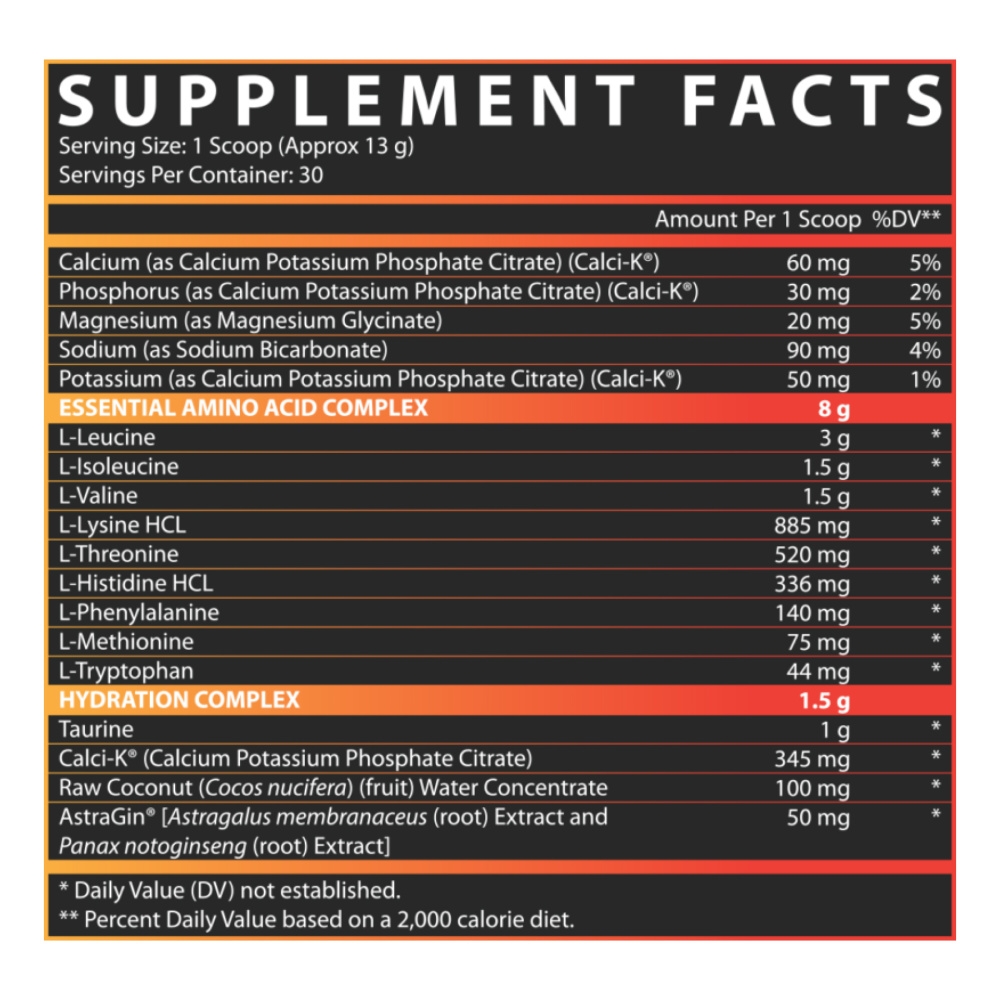 Размер порции: 1 мерная ложка (около 13 г) Количество порций в упаковке: 30 Количество на порцию %DV Кальций (в виде цитрата фосфата кальция и калия) (Calci-K™) 60 мг 5% Фосфор (в виде цитрата фосфата кальция-калия) (Calci-K™) 30 мг 2% Магний (в виде глицината магния) 20 мг 5% Натрий (в виде бикарбоната натрия) 90 мг 4% Калий (в виде цитрата кальция фосфата калия) (Calci-K™) 50 мг 1% КОМПЛЕКС НЕЗАМЕНИМЫХ АМИНОКИСЛОТ 8 г L-лейцин 3 г * L-изолейцин 1,5 г * L-валин 1,5 г * L-лизин гидрохлорид 884,75 мг * L-треонин 520,05 мг * L-гистидин гидрохлорид 335,94 мг * L-фенилаланин 139,88 мг * L-метионин 75 мг * L-триптофан 44,38 мг * УВЛАЖНЯЮЩИЙ КОМПЛЕКС 1,5 г Таурин 1 г * Calci-K™ (цитрат фосфата кальция и калия) 345 мг * Сырой кокос ( Cocos nucifera) (фрукты ) Водный концентрат 100 мг * AstraGin™ [экстракт Astragalus membranaceus (корень) и экстракт Panax notoginseng (корень)] 50 мг * *Дневная норма (DV) не установлена. ДРУГИЕ ИНГРЕДИЕНТЫ: лимонная кислота, мальтодекстрин, натуральные и искусственные ароматизаторы, диоксид кремния, сукралоза. ПРЕДУПРЕЖДЕНИЕ О АЛЛЕРГЕНАХ: орехи (кокос).
