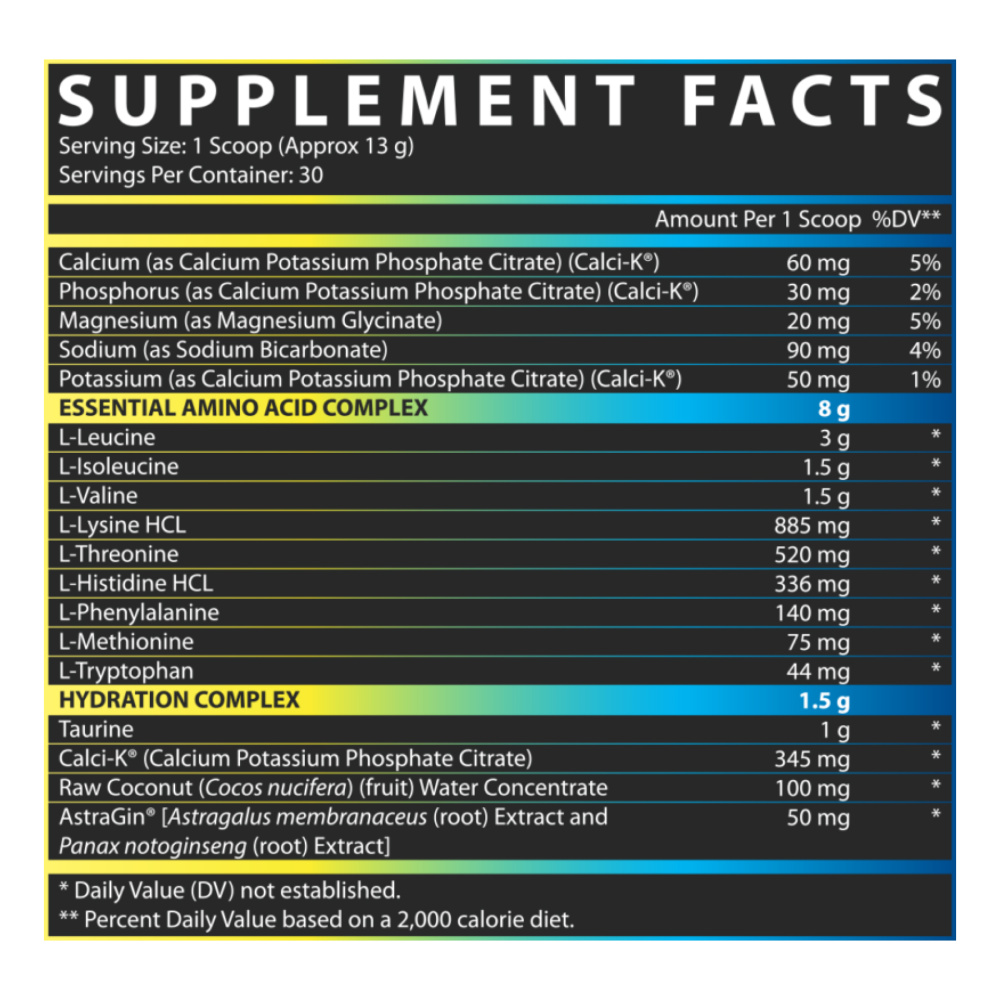 Размер порции: 1 мерная ложка (около 13 г) Количество порций в упаковке: 30 Количество на порцию %DV Кальций (в виде цитрата фосфата кальция и калия) (Calci-K™) 60 мг 5% Фосфор (в виде цитрата фосфата кальция-калия) (Calci-K™) 30 мг 2% Магний (в виде глицината магния) 20 мг 5% Натрий (в виде бикарбоната натрия) 90 мг 4% Калий (в виде цитрата кальция фосфата калия) (Calci-K™) 50 мг 1% КОМПЛЕКС НЕЗАМЕНИМЫХ АМИНОКИСЛОТ 8 г L-лейцин 3 г * L-изолейцин 1,5 г * L-валин 1,5 г * L-лизин гидрохлорид 884,75 мг * L-треонин 520,05 мг * L-гистидин гидрохлорид 335,94 мг * L-фенилаланин 139,88 мг * L-метионин 75 мг * L-триптофан 44,38 мг * УВЛАЖНЯЮЩИЙ КОМПЛЕКС 1,5 г Таурин 1 г * Calci-K™ (цитрат фосфата кальция и калия) 345 мг * Сырой кокос ( Cocos nucifera) (фрукты ) Водный концентрат 100 мг * AstraGin™ [экстракт Astragalus membranaceus (корень) и экстракт Panax notoginseng (корень)] 50 мг * *Дневная норма (DV) не установлена. ДРУГИЕ ИНГРЕДИЕНТЫ: лимонная кислота, мальтодекстрин, натуральные и искусственные ароматизаторы, диоксид кремния, сукралоза. ПРЕДУПРЕЖДЕНИЕ О АЛЛЕРГЕНАХ: орехи (кокос).