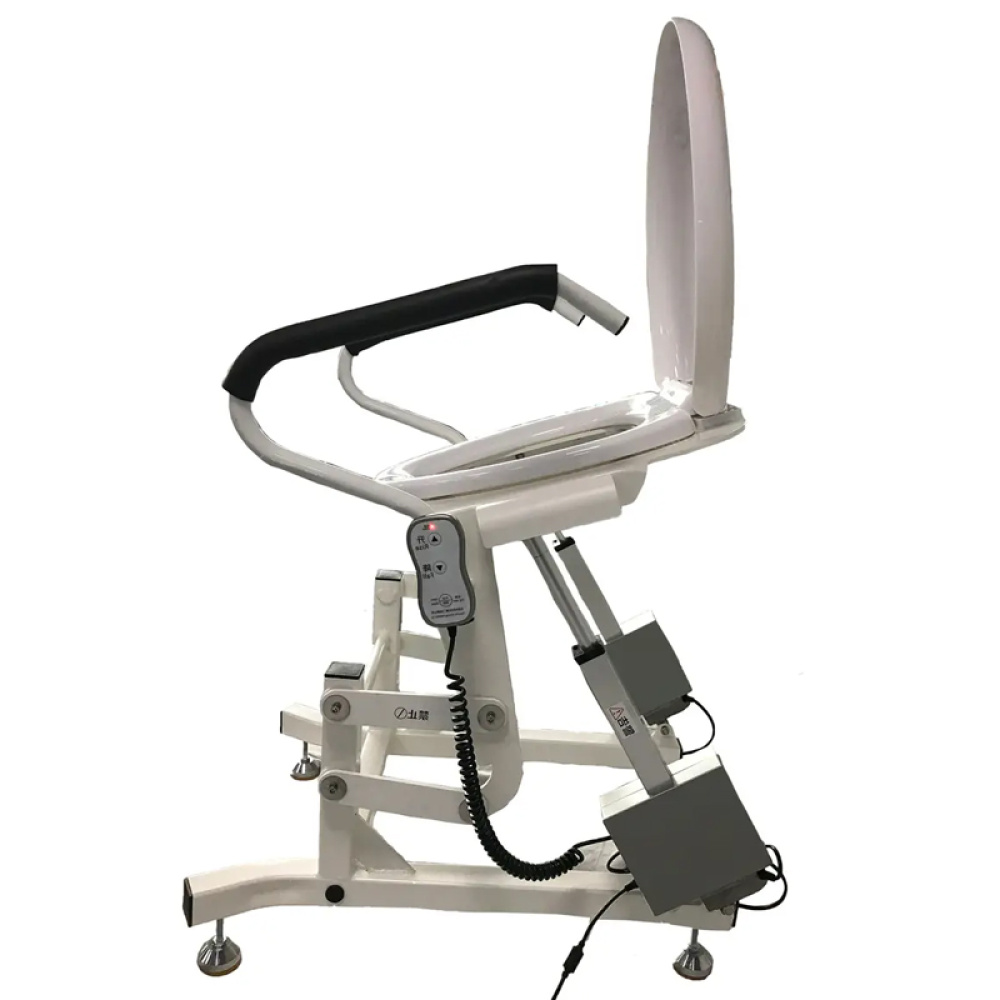 Кресло для туалета автоматически подымается и опускается с помощью двух электромоторов. Управляется с помощью пульта.
