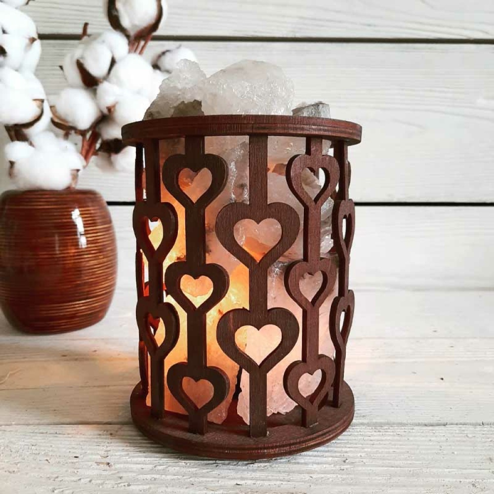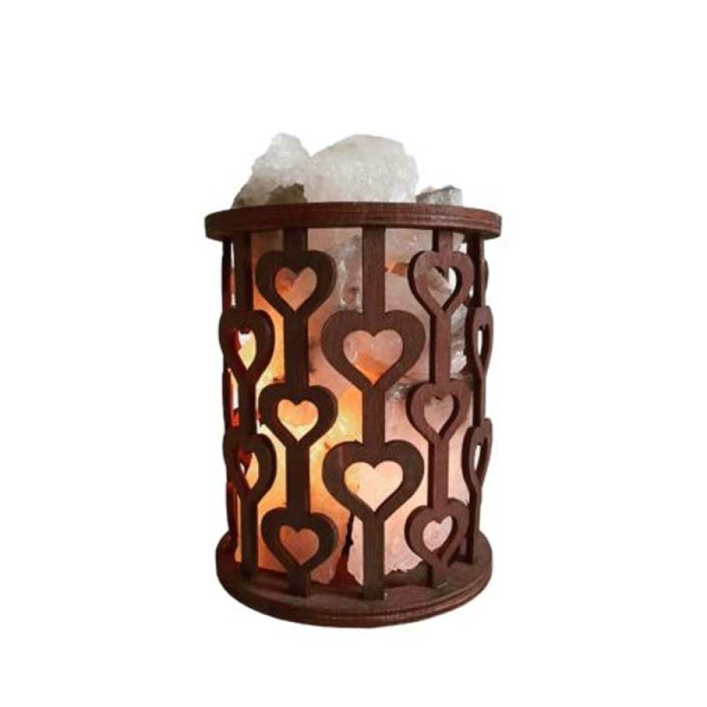 Соляной светильник из белой каменной соли с деревянной накладкой “Корзина Сердца” и регулятором яркости лампы, упакована в индивидуальную коробку.