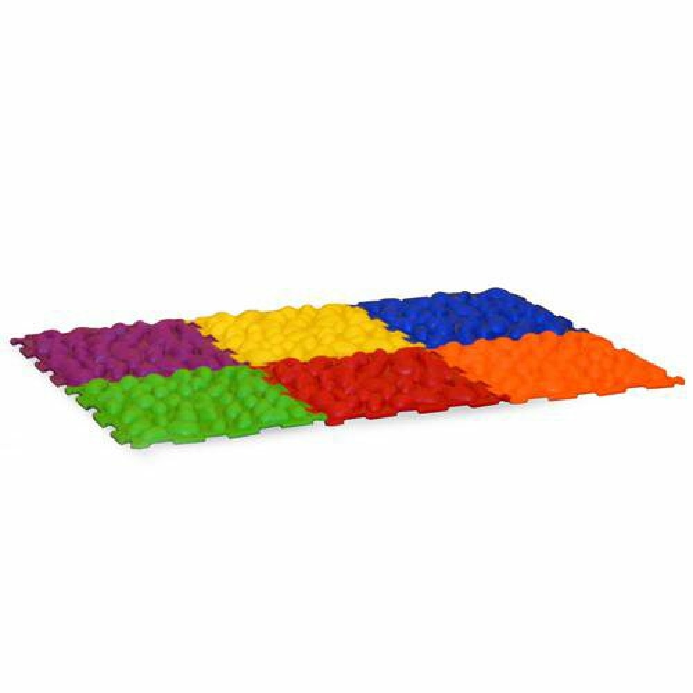 Пазлы квадратной формы с камешками разных размеров и вида, расположенных в хаотичном порядке. Камешки массажного коврика подобраны так, что заставят работать и укреплять мышцы стопы, что являет собой эффективный способ профилактики плоскостопия у детей, а также помогают уменьшить усталость ног у взрослых.
