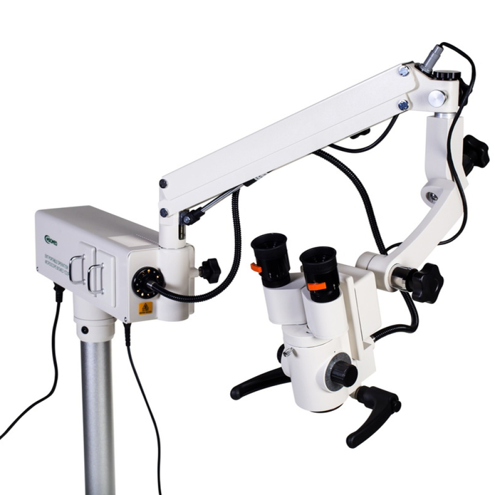 Микроскоп обеспечивает стереоскопический эффект, имеет три ступени увеличения. В системе освещения используется источник света, который полностью безопасен для человеческого глаза.