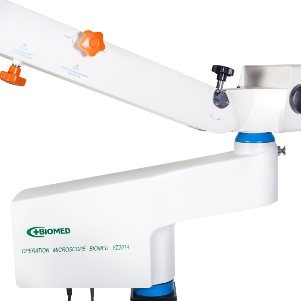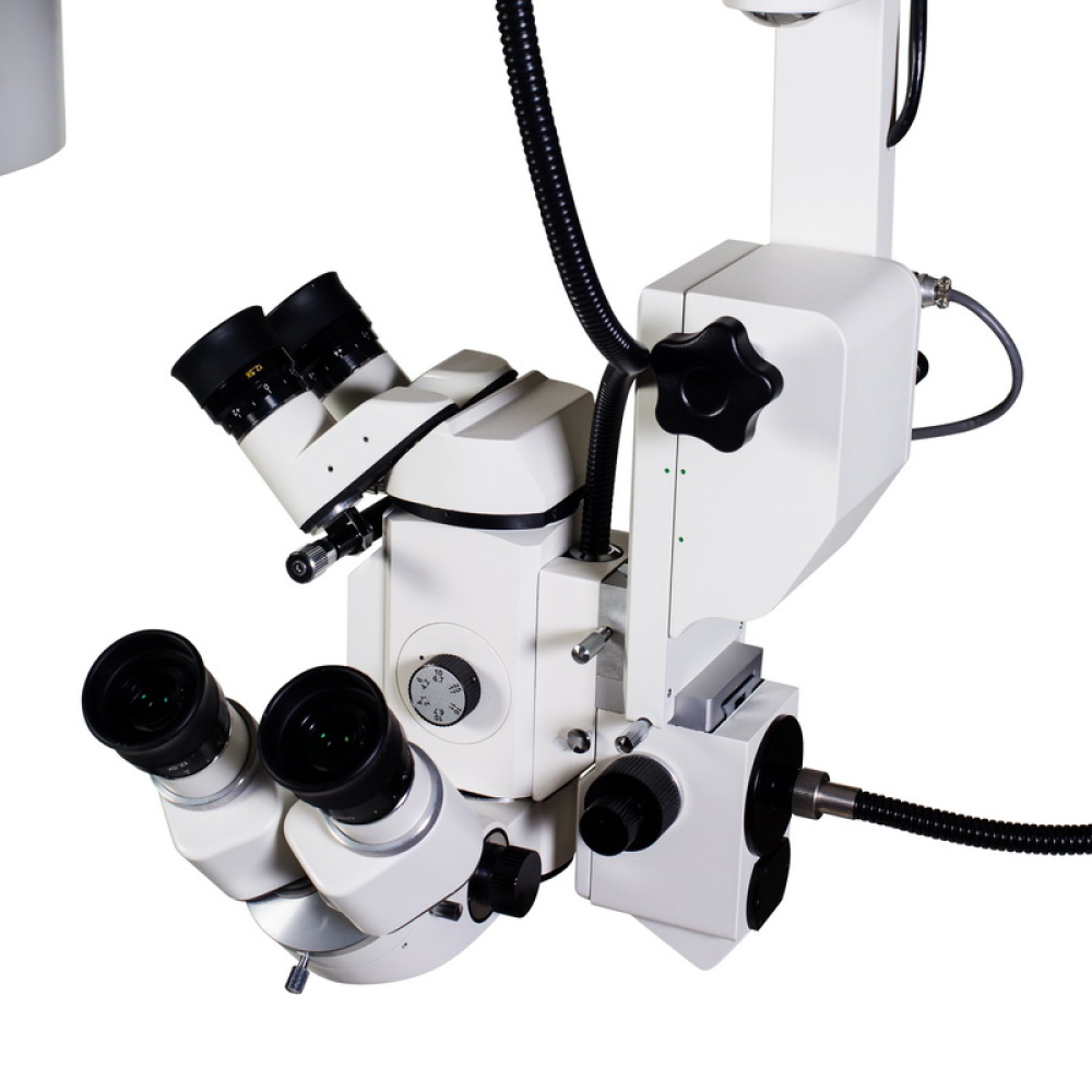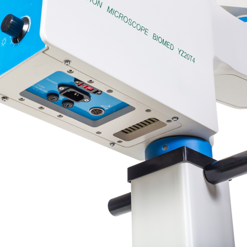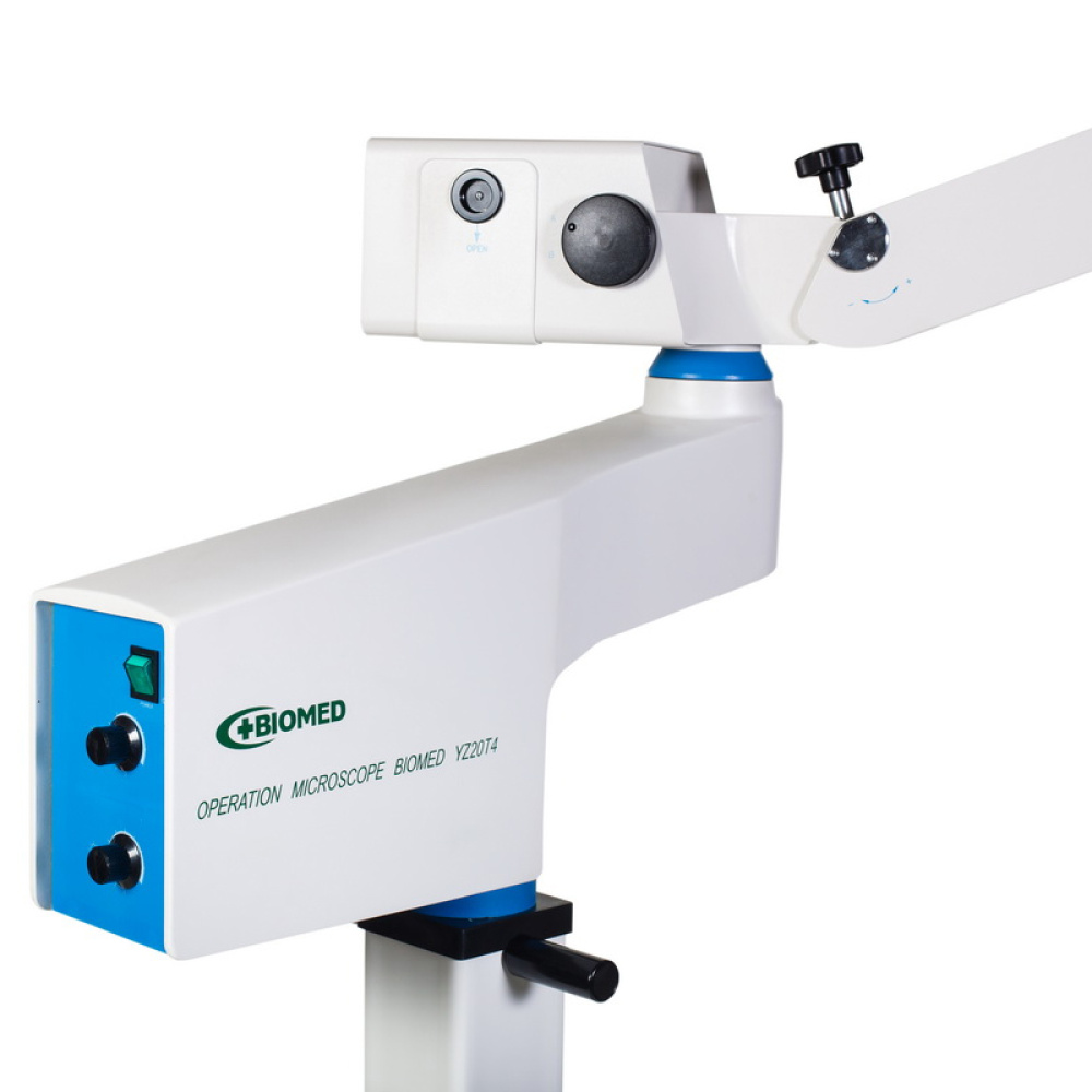 Операционный микроскоп YZ20T4 предназначен для проведения офтальмологических, ортопедических и хирургических операций хирургом и помощником. Обеспечивает стереоскопический эффект. Имеет два бинокуляра и один оптический путь. Основной микроскоп имеет пятиступенчатое увеличение, а вспомогательный – трехступенчатое. Вспомогательный микроскоп можно установить под углом 90° влево или вправо от основного микроскопа.