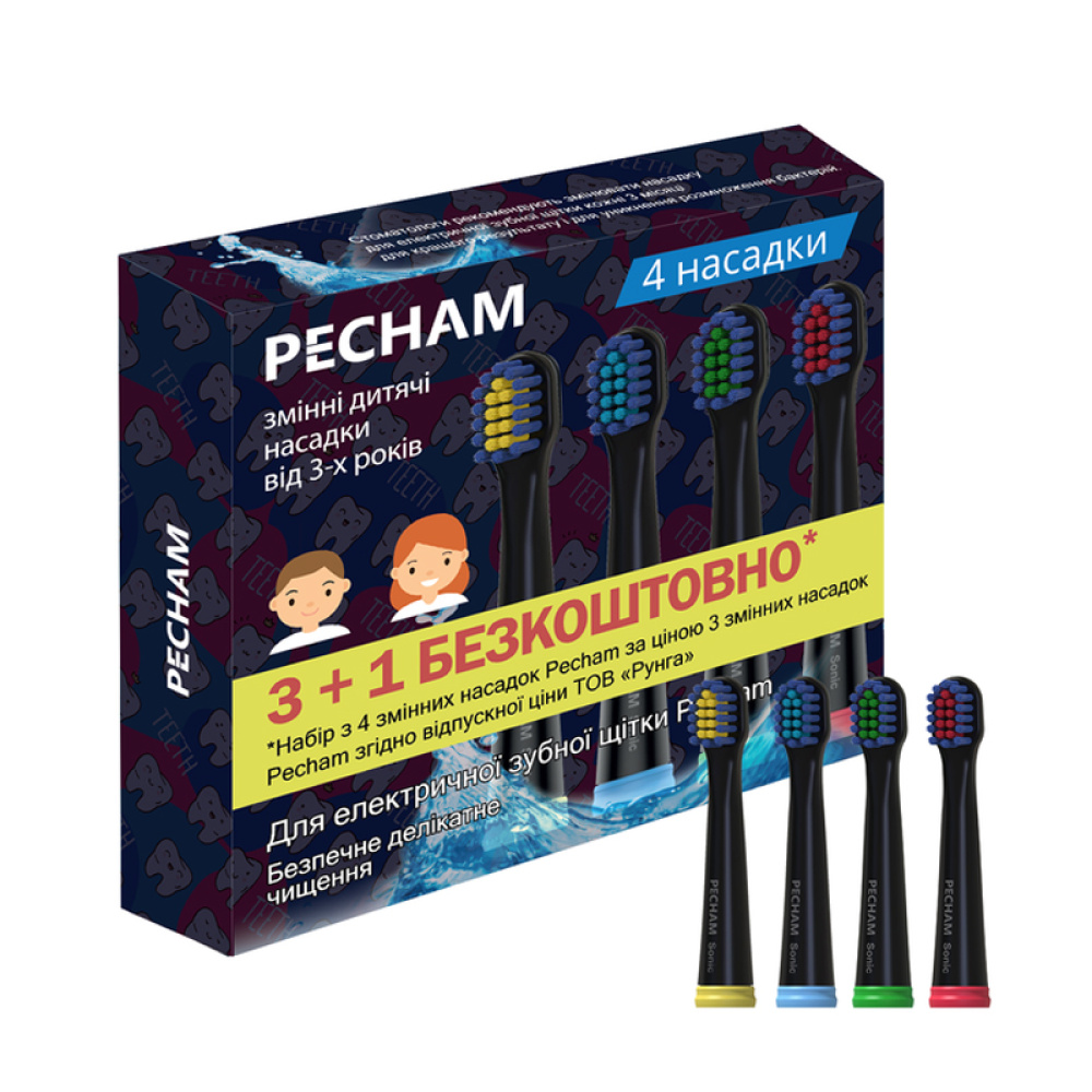Насадки на зубные щетки PECHAM совместимы с электрощетками бренда. Корпус насадок изготовлен из качественного пластика ABS/TP, нейлоновые щетинки синего цвета содержат индикаторы, меняют цвет при полном износе.