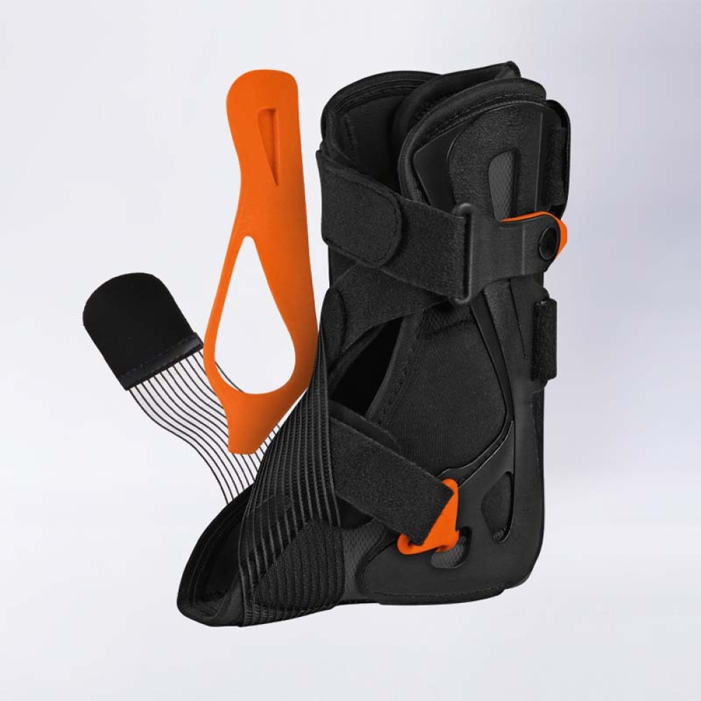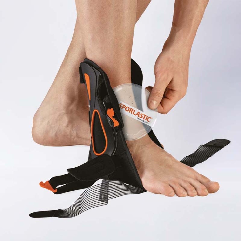 Инновационный ортез голеностопного сустава можно легко снять в три этапа в соответствии с курсом лечения. В острой фазе стабилизирует, успокаивает и охлаждает голеностопный сустав в соответствии с правилом RICE (отдых, лед, компрессия, подъем). Благодаря гибкой конструкции, напоминающей башмак, и простоте в обращении, его можно использовать для вторичной профилактики после 3 этапов демонтажа. QR-код на упаковке продукта дает вам доступ к лечебной гимнастике.