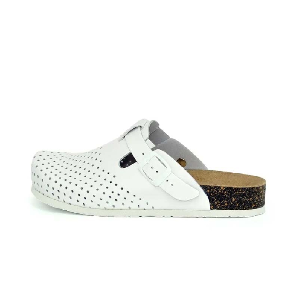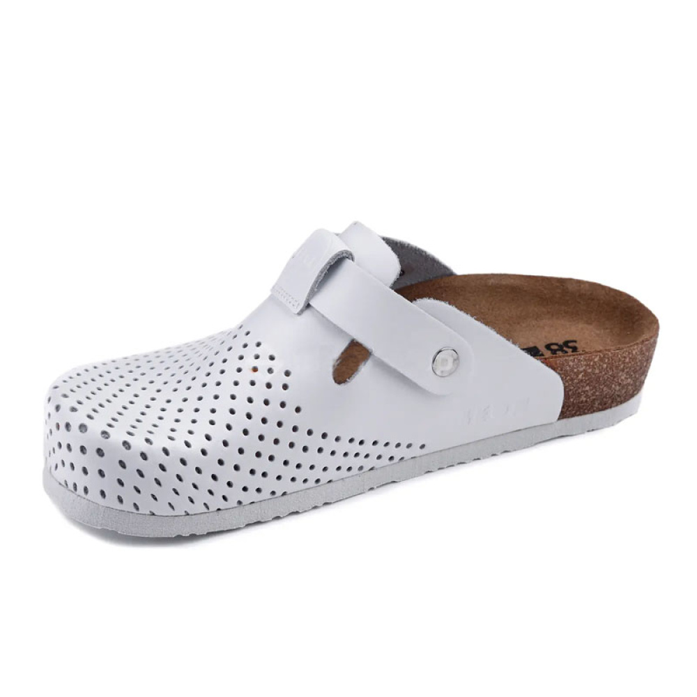 Материал верха – натуральная кожа. Тапочки сабо похожи на кроксы формой и наличием перфораций, чтобы ножка дышала. С таким количеством отверстий нога не потеет. Для более плотного прилегания есть небольшой фиксационный ремешок на своде стопы.