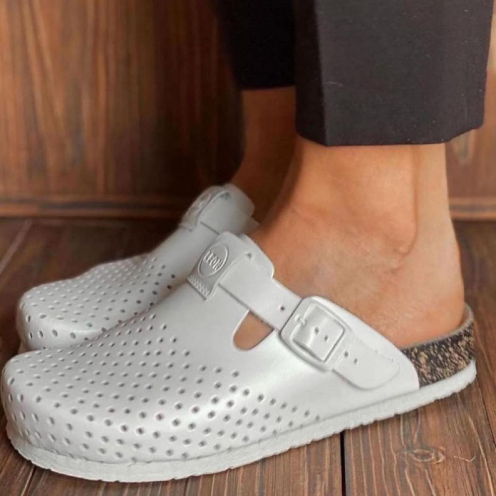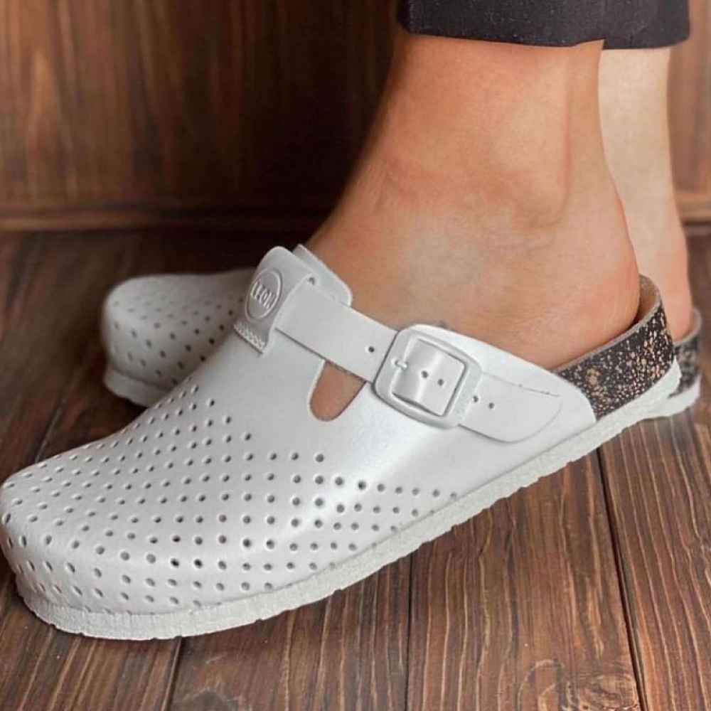 Стелька выполнена из натуральной кожи, что предотвращает скольжение ноги по сабо. Внутри стельки массажная мемори-пена, которая обеспечивает разгрузку стопы от ударного напряжения, более легкую и правильную походку, а также разгрузку позвоночника и правильную осанку. После дня в этих шлепках ноги устанут меньше, чем в обычной обуви.