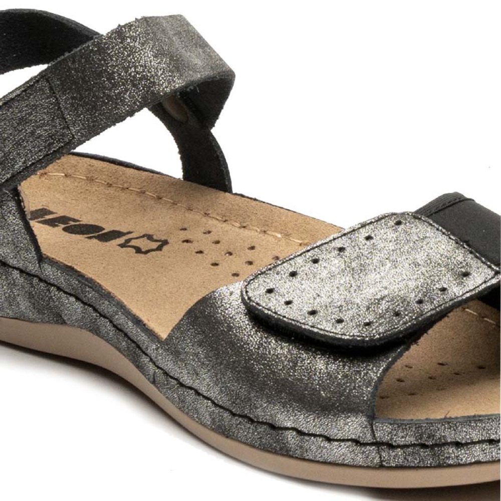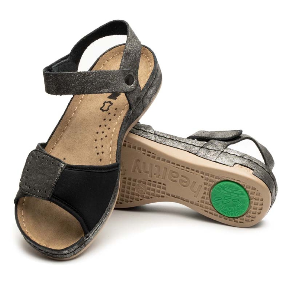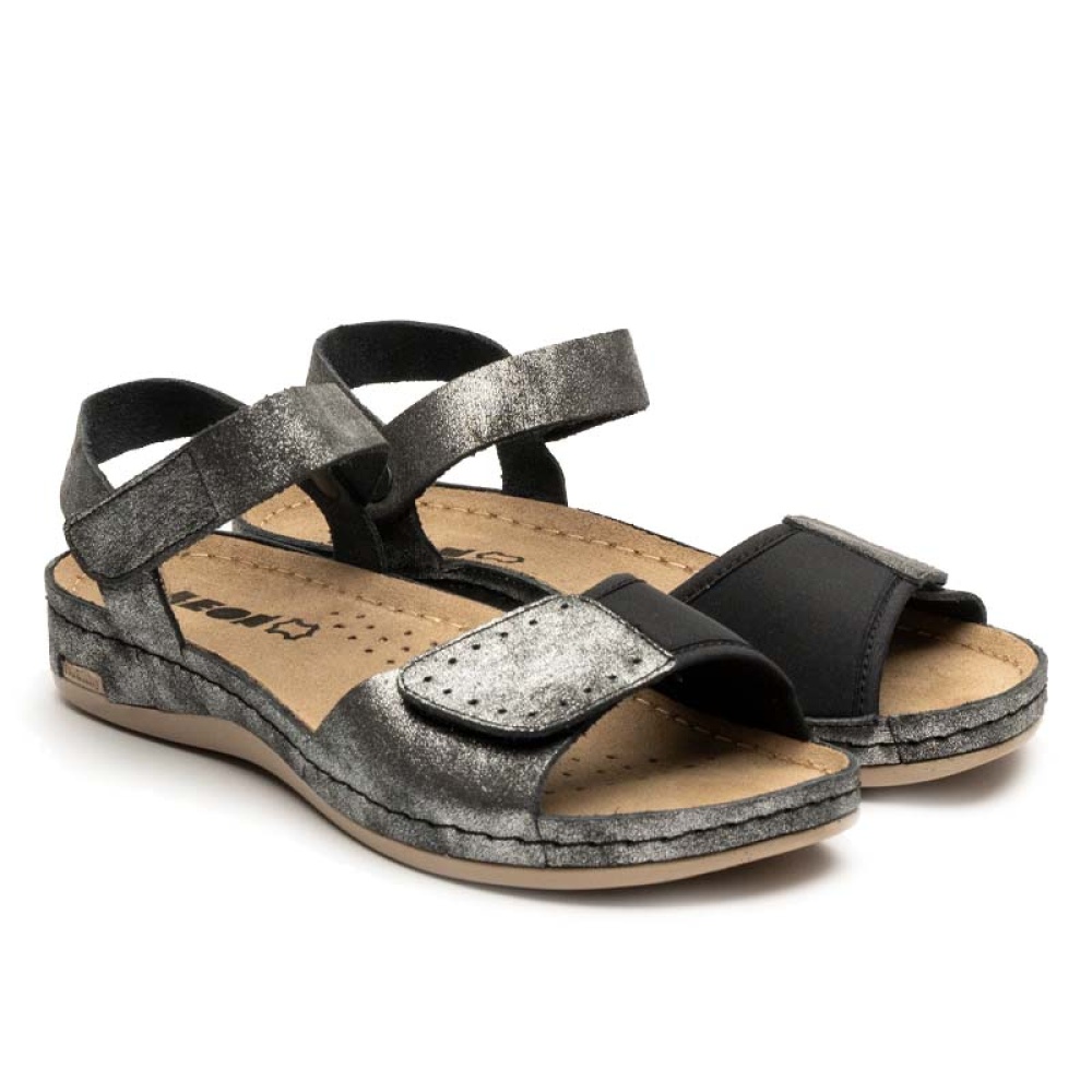 Женские сандалии из натуральной кожи с эластичным материалом, подходящим для косточек, с кожаной подошвой, содержащей массажный гель. Подошва изготовлена из полиуретановой массы, в состав которой входит противоскользящая вставка, препятствующая скольжению