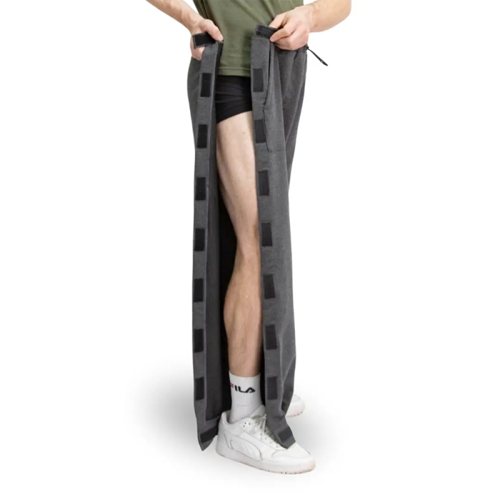 Адаптивные брюки для людей с травмами нижних конечностей, в послеоперационном состоянии или в период реабилитации. Разъёмные штанины на застёжках по всей длине упрощают надевание при гипсе/ортезе и дают быстрый доступ для осмотров и перевязок.
