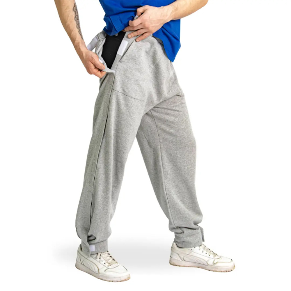 Легкие больничные адаптивные штаны для периода восстановления. Разъемы по штанинам обеспечивают быстрый доступ для ухода и позволяют переодевать пациента без лишнего дискомфорта.