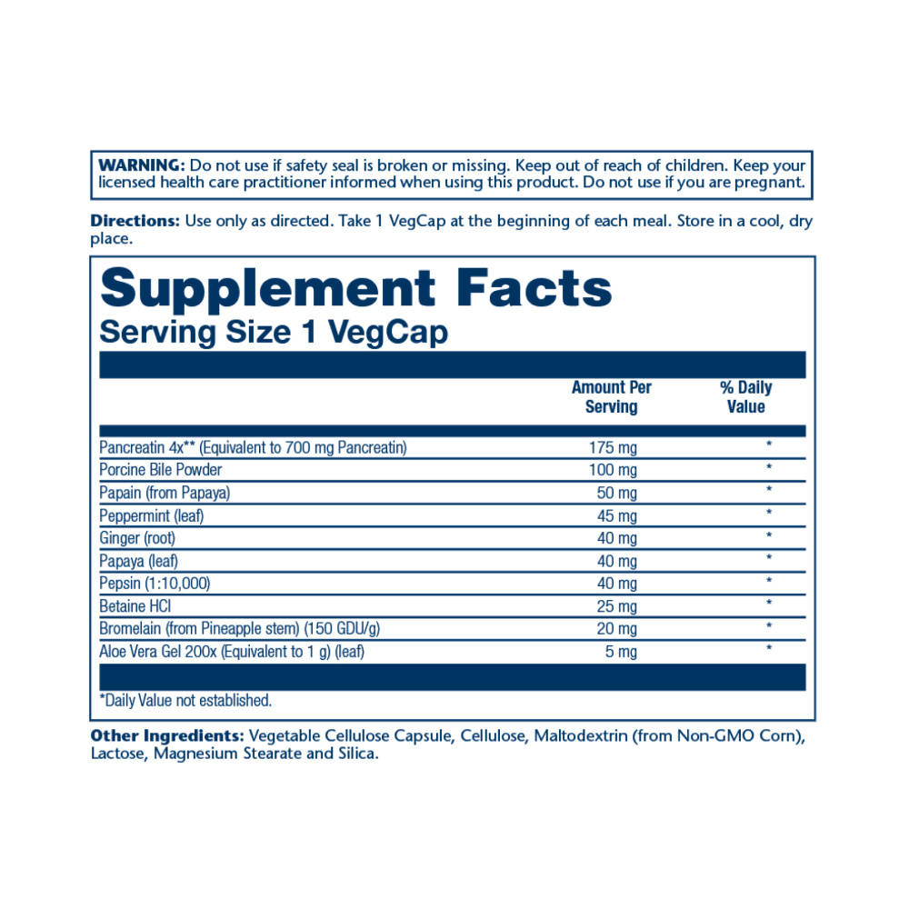 Обеспечивает мощную дозу панкреатина 4X (17500 единиц протеазы и амилазы каждая + 1400 единиц активности липазы) плюс пепсин и папаин