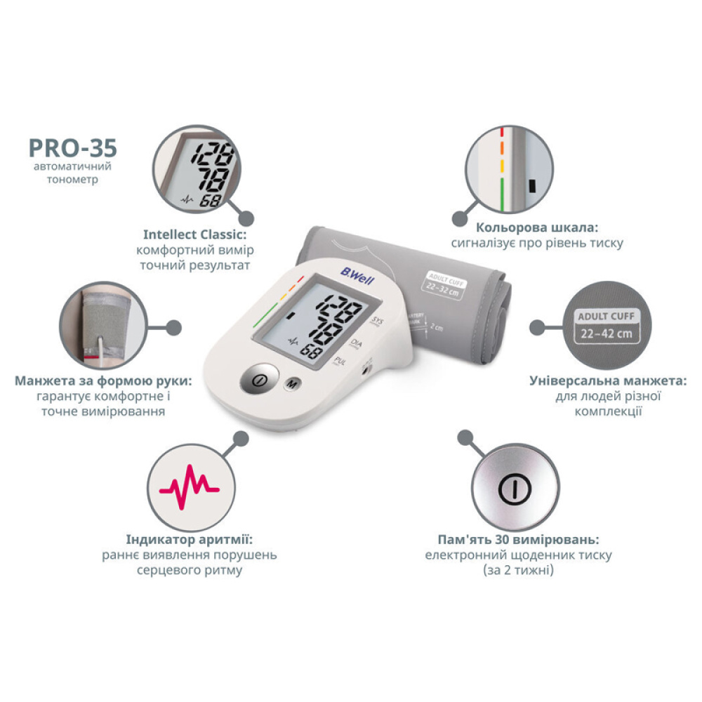 Швейцарский производитель B.Well известен своими высококачественными, безупречными приборами медицинского назначения. Тонометр автоматический на плечо с адаптером и манжетой 22-42см PRO-35 B.Well - надежный помощник для тех, кто следит за своим давлением, который точно измерит АД и выдаст результат. Специальная шкала на дисплее показывает уровень давления — оптимальный, повышенный или высокий. Уровень измеренного АД определяется по классификации Европейского общества гипертонии (ESH). Благодаря анатомической манжете B.Well измерение проходит комфортно и быстро.