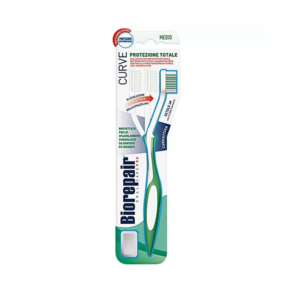Модель зубной щетки «Совершенная чистка» Medium для ежедневного ухода Biorepair уникальна своей формой и функциональностью. С ее помощью не выходя из дома, вы обеспечите уход за зубами, деснами и языком. Щетинки средней жесткости позволяет деликатно ухаживать за зубами и при этом эффективно удалять налет. Использовать щетку целесообразно: