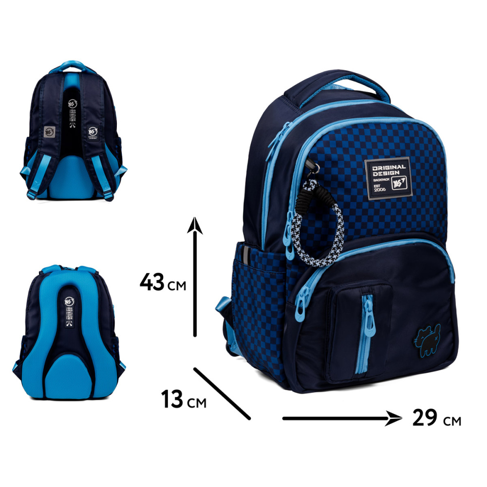 Два великих відділення, одна містка передня кишеня, ретельно розроблений внутрішній органайзер допоможуть тримати у порядку всі шкільні речі та канцелярське приладдя. В бокових кишенях розміститься пляшка з водою або термос, а також інші дрібні речі.