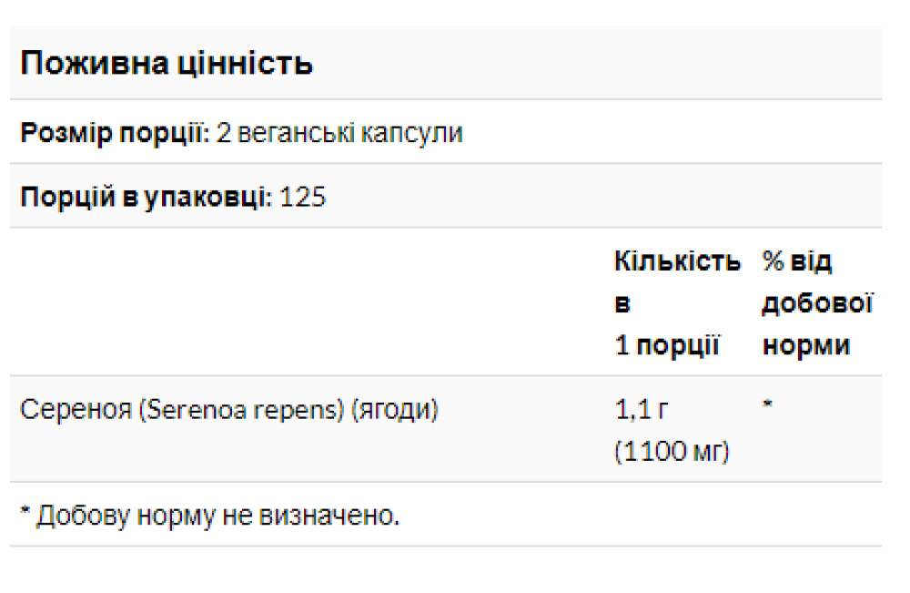 Екстракт ягід Пальметто (плоди) – 1,1 г (1100 мг)
