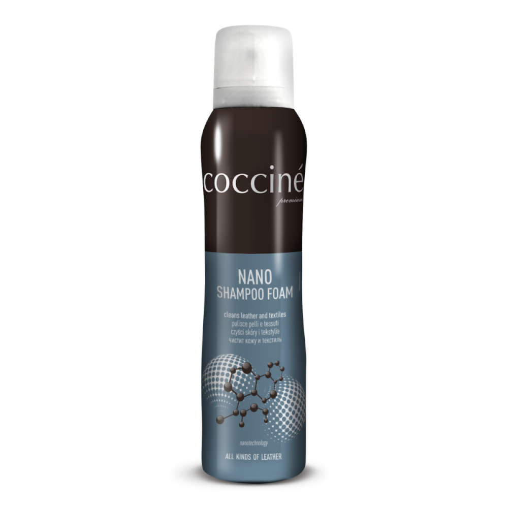 Універсальний безбарвний наношампунь для взуття у формі пінки ефективно й без особливих зусиль видаляє пил, плями та інші забруднення, які утворилися на поверхні шкіри, а також залишки раніше використаних консервувальних засобів для догляду за взуттям. Призначений як для гладкої, так і для замшевої шкіри, а також для взуття з текстилю. Миттєвий результат. Спосіб застосування: видалити пісок та інші забруднення, нанести Nano Shampoo на м'який матеріал і очистити всю поверхню, рівномірно втираючи засіб у шкіру (не терти занадто сильно, щоб уникнути точкового нанесення та появи розводів), дати висохнути, нанести консервувальні засоби Coccine. Перед використанням перевірити дію препарату на непомітній ділянці. Продукт може злегка освітлити шкіру.