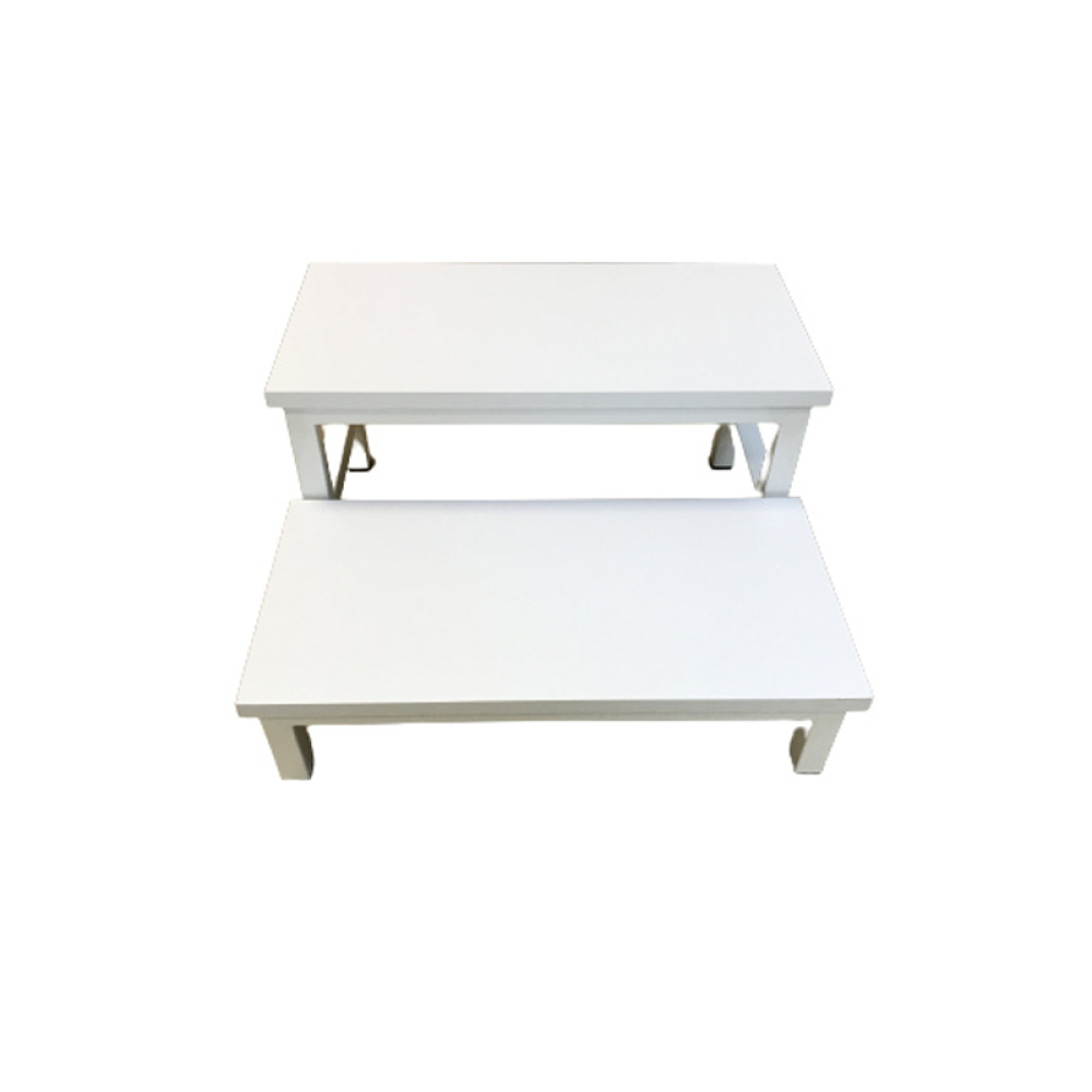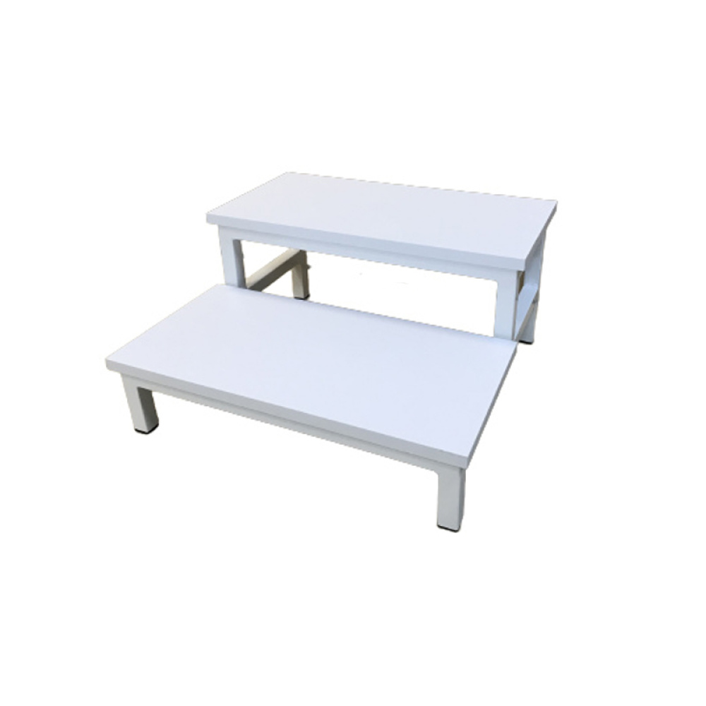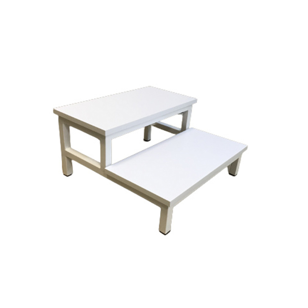 Подвійні східці представляють собою металевий каркас, виготовлений із металевої труби квадратного перетину, фарбованої порошковою фарбою з антибактеріальними властивостями, та дві опорні площадки, виконані з міцного ламінованого ДСП білого кольору.