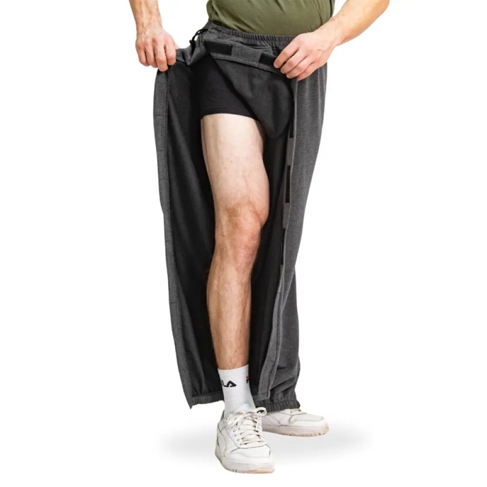 Адаптивні спортивні штани для періоду відновлення та носіння гіпсу/фіксаторів. Липучки по всій довжині штанин спрощують перевдягання і догляд, а широкі манжети дозволяють застібати штанини навіть поверх гіпсу.