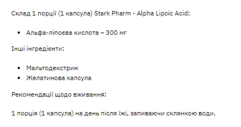 Належить до групи умовних вітамінів, має високу біологічну активність. У спортивному харчуванні використовується як антиоксидантний засіб, а також прискорює вироблення найважливішого білкового гормону підшлункової залози, який регулює вуглеводний обмін в організмі - інсулін. Об'ємні тренування з високою інтенсивністю провокують вироблення вільних радикалів, збільшуючи при цьому оксидантний стрес у м'язових тканинах. Альфа-ліпоєва кислота за рахунок антиоксидантних властивостей зменшує виникнення вільних радикалів, мінімізуючи, а в деяких випадках і зовсім зупиняючи вироблення вільних радикалів, а також зменшується процес розщеплення білків та міофібрил. Таким чином, систематичне вживання Alpha-Lipoic Acid Stark Pharm дозволить спортсменам тренуватися з більш високою інтенсивністю, але часу для відновлення після таких тренувань знадобиться значно менше, що призведе до зростання м'язової маси та збільшення швидкісно-силових показників. Так як вже до наступного тренування м'язи атлета відновлено і настав процес суперкомпенсації, то поставлені завдання спортсмена проходитимуть набагато легше і, більше того, вже на наступному тренуванні можна збільшувати вагу на штанзі або ставити більш високу мету в аеробних видах спорту. Lipoic-Acid Stark Pharm має яскраво виражені інсуліноподібні якості, покращуючи при цьому засвоєння глюкози в м'язах. Максимальне збереження глікогену у м'язах та підтримання глюкози в крові мінімізує руйнування м'язової тканини під час вимушеного голодування та зменшує дію катаболізму. Планомірне розподіл інтенсивності в тренувальному процесі, а також грамотне складання раціону атлета в сукупності з вживанням Lipoic-Acid Stark Pharm може призвести до жироспалюючий ефект без втрати м'язової маси. Посилюється термогенез та підвищуються витрати енергії за рахунок резервних відкладень жиру. Альфа-ліпоєва кислота завдяки своїм антиоксидантним здібностям уповільнює старіння людського організму, відновлює порубчані клітини та забезпечує м'язи глікогеном. Дія Lipoic-Acid Stark Pharm: Виведення токсинів із організму; Уповільнення катаболічних процесів; Омолодження та звільнення від зморшок; збільшення порога втоми; прискорення процесу відновлення; Жироспалюючий ефект. Lipoic-Acid Stark Pharm одна з небагатьох біодобавок, яка зарекомендувала себе серед спортсменів та людей, які не відвідують тренажерний зал, але у зв'язку з активним способом життя отримують високе фізичне чи психологічне навантаження. За рейтингом даний препарат серед усіх антиоксидантів зарекомендував себе як найефективніший, і справді, компанія StarkPharm використовує добірну сировину преміум класу. Склад 1 порції (1 капсула) Stark Pharm - Alpha Lipoic Acid: Альфа-ліпоєва кислота 300 мг Інші інгредієнти: Мальтодекстрін Желатинова капсула Рекомендації щодо вживання: 1 порція (1 капсула) 2 рази на день, за 30 хвилин до їди, запиваючи склянкою води.