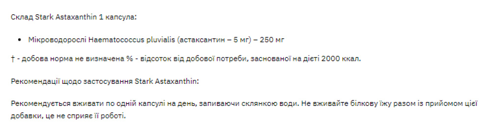 Stark Astaxanthin є невід'ємною добавкою як для людини, яка веде активний спосіб життя, так і для професійних спортсменів. Крім виведення токсинів з організму антиоксидант Stark Astaxanthin має низку позитивних властивостей: