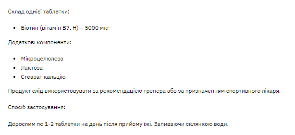 Рекомендується вживати як харчову добавку. Біотин або вітамін B7, H - водорозчинний вітамін групи B, який часто застосовується у спорті, тому що грає величезну роль у метаболізмі амінокислот, а також у процесах, що забезпечують м'язи енергією. Нерідко саме дефіцит біотину спричиняє повільне зростання м'язової маси. Біотин не рідко застосовують у косметології з метою покращення стану волосся, нігтів та шкіри. Склад однієї таблетки: біотин (вітамін B7, H) 5000 мкг Додаткові компоненти: Мікроцелюлоза, лактоза, кальцію стеарат. Продукт слід використовувати за рекомендацією тренера або призначення спортивного лікаря. Спосіб застосування: Дорослим по 1-2 таблетки на день після їди. Запиваючи склянкою води. Застереження: не перевищувати денну кількість, що рекомендується. Протипоказання: індивідуальна непереносимість компонентів продукту, діти, вагітність та період лактації. Термін придатності: 24 місяці від дати виготовлення (дату виробництва або дату споживання Вживати до, дивись на етикетці (упаковці)). У сухому, захищеному від сонця місці при температурі від 5' до 25' та відносній вологості повітря не більше 75%; у недоступному для дітей місці.