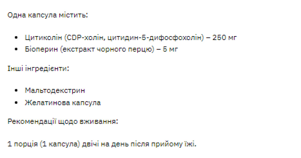 Харчова добавка Stark Pharm Citicoline (цитиколін, когніцин, CDP-холін) це ноотроп, проміжне з'єднання в утворенні фосфатидилхоліну з холіну. Дослідження показують, що препарат підвищує щільність дофамінових та ацетилхолінових рецепторів, і передбачається, що він здатний запобігати погіршенню пам'яті внаслідок негативних умов довкілля. За попередніми даними, добавки цитиколіну допомагають покращити увагу та розумову енергію, що може бути корисним при лікуванні синдрому дефіциту уваги та гіперактивності. Також було виявлено вплив на рівень АКТГ та інших гормонів передньої частки гіпофізу (це може бути корисним для деяких людей, але не виключено небажаних наслідків при захворюваннях, пов'язаних з гіперсекрецією АКТГ та кортизолу). Також показаний при органічному пошкодженні мозку, оскільки він впливає на нейропептиди.