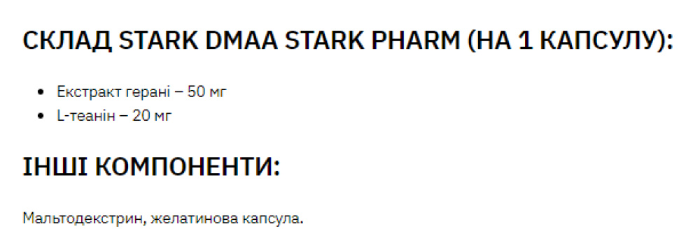 Stark DMAA & Caffeine Stark Pharm – у зручній формі, капсулах, що підвищує працездатність, стійкість та витривалість, як фізичну, так і розумову. Діюча речовина - екстракт герані, разом з кофеїном, не має значних негативних побічних ефектів, у порівнянні з використанням одного кофеїну для такого ж результату. Поряд з іншими препаратами подібного впливу варто відзначити, що саме DMAA є найефективнішим з точки зору обивателів тренажерних залів.