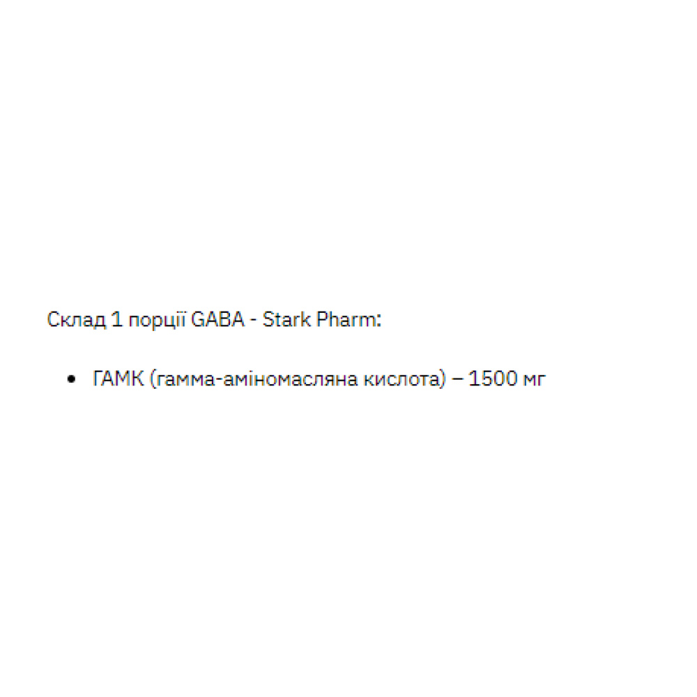 Харчова добавка Stark GABA - Stark Pharm містить гамма-аміномасляну кислоту - є однією з найбільш важливих медіаторів головного мозку, який володіє пригнічуючою дією. За природою це амінокислота. GABA в організмі людини індукує сон та усуває психічне збудження.