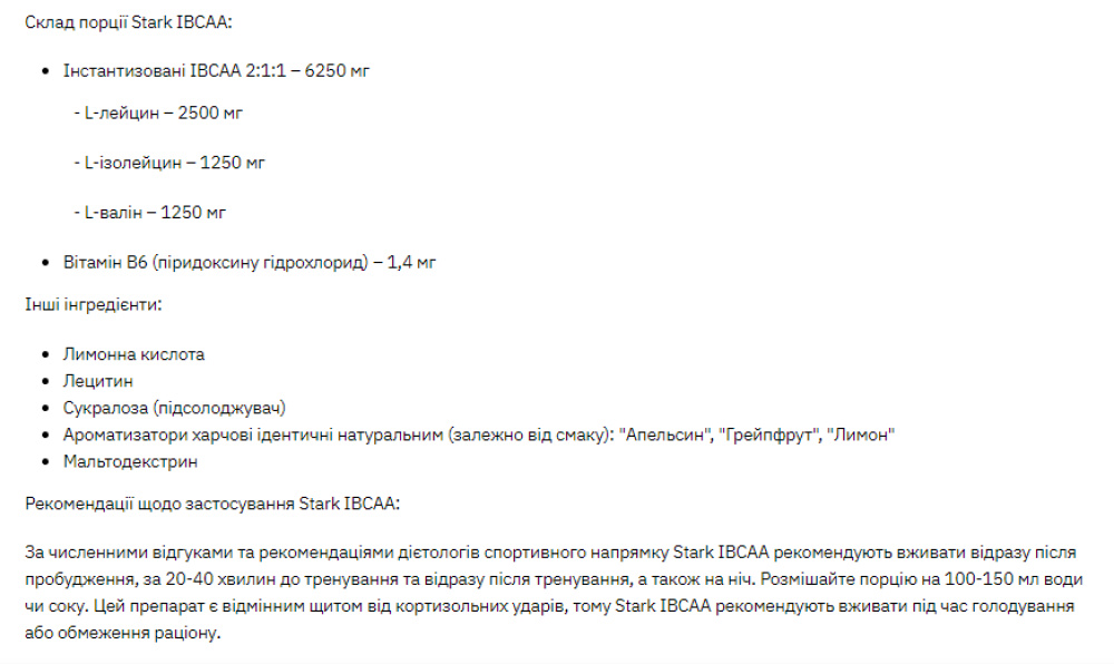 Stark IBCAA – це поєднання незамінних амінокислот L-форми, які значною мірою синергетично посилюють дії один одного. Як відомо, лейцин, ізолейцин і валін живлять 35% всіх м'язових тканин, що прискорює процес набору сухої м'язової маси. Крім яскраво вираженого анаболічного ефекту, Stark IBCAA є невід'ємною добавкою для підживлення м'язових клітин як паливо. Саме ВСАА живлять енергією міофібрили під час важких тренувань.