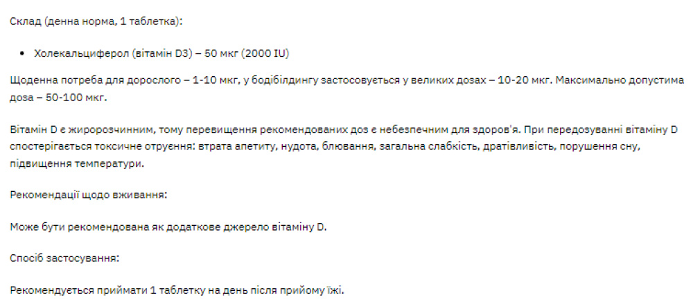 Це добавка вітаміну D3 із концентрацією 2000 IU (50 мкг) на одну таблетку.