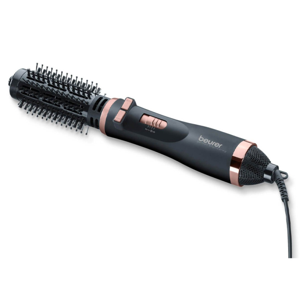 Beurer HT 80 — ротаційний фен-щітка для швидкого створення об'єму, гладких або хвилястих укладок. Автоматичне обертання насадки значно спрощує укладку навіть довгого волосся. Керамічне покриття та інтегрована іонізація захищають волосся від перегріву та надають йому здорового блиску, а два режими нагріву, два режими подачі повітря та холодний обдув дозволяють зафіксувати зачіску.