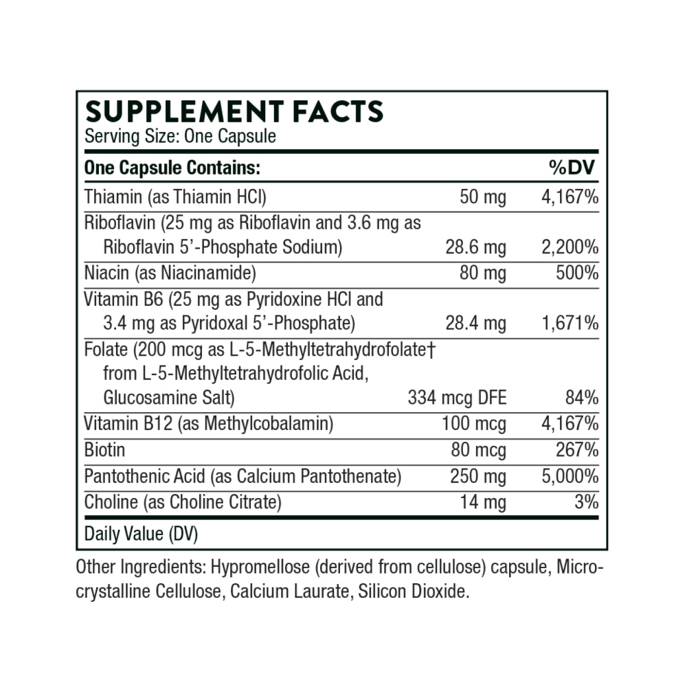 Thorne's Stress B-Complex є незамінним вибором для людей, які шукають підтримку харчування під час стресового способу життя. Поживні речовини в Stress B-Complex діють синергетично в усьому організмі, сприяючи виробленню клітинної енергії, формуванню здорових еритроцитів, когнітивним функціям і настрою.* Додатковий вітамін B5 (пантотенова кислота), важлива поживна речовина для здоров’я надниркових залоз, нервової системи, і імунну функцію, доповнює оптимальний баланс восьми основних вітамінів групи В плюс холін.