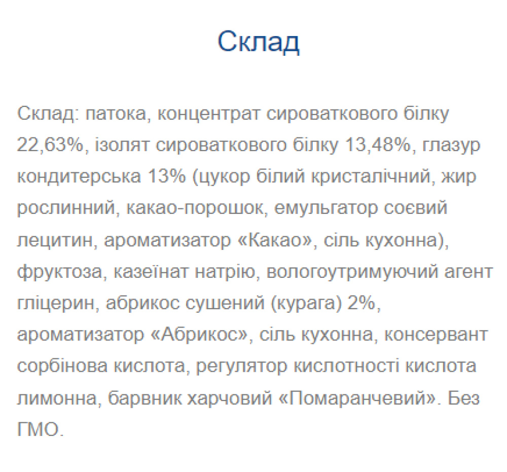 Найбільший та найкращий батончик в Україні. Цілих 28 грам високоякісного білка на 80 грам батончика. Як джерело білка використовується концентрат сироваткового білка, ізолят сироваткового білка та казеїн. Усього 21 грам вуглеводів. У складі ви не знайдете згущеного молока, мальтодекстрину та інших "не дієтичних" інгредієнтів, які так люблять використовувати багато виробників. Протеїнові батончики Monsters: зручний, швидкий та смачний спосіб отримати необхідну порцію справжнього білка та перекусити протягом дня. Поживна цінність 1 батончика (80 грам): Енергетична цінність: 274 кка Білки 28,6 г; жири 6,4 г; Вуглеводи 21 г. Склад: патока, концентрат сироваткового білка 22,63%, ізолят сироваткового білка 13,48%, фруктоза, казеїнат натрію, абрикос сушений (курага), глазур кондитерська (цукор білий кристалічний, жир рослинний, соєвий лецитин, ароматизатор "Какао", сіль кухонна)