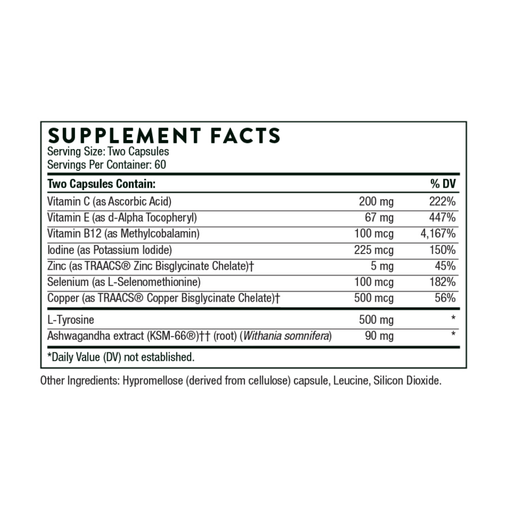 Гормони щитовидної залози регулюють метаболізм білків, жирів і вуглеводів, тим самим впливаючи на те, як ці макроелементи сприяють виробленню енергії. Дефіцит або надлишок гормонів щитовидної залози може мати далекосяжні наслідки. Наприклад, високий рівень кортизолу може впливати на функцію щитовидної залози, що призводить до зниження рівня тироксину (Т4) або недостатності перетворення Т4 в його активну форму — трийодтиронін (Т3). Кожен гормон щитовидної залози виконує безліч важливих функцій в організмі; наприклад, Т4 підтримує об'єм серцевого викиду за хвилину, частоту серцевих скорочень, частоту дихання і базальну швидкість метаболізму – низька базальна швидкість метаболізму може викликати у людини втому, озноб і проблеми пов'язані з втратою ваги. Тироксин рослинного походження забезпечує підтримку здорової функції щитовидної залози та її живлення, перетворення Т4 в Т3, а так само підтримку нормального рівня кортизолу. Ця формула, що підтримує негландулярну функцію щитовидної залози, виробляється лише Thorne.