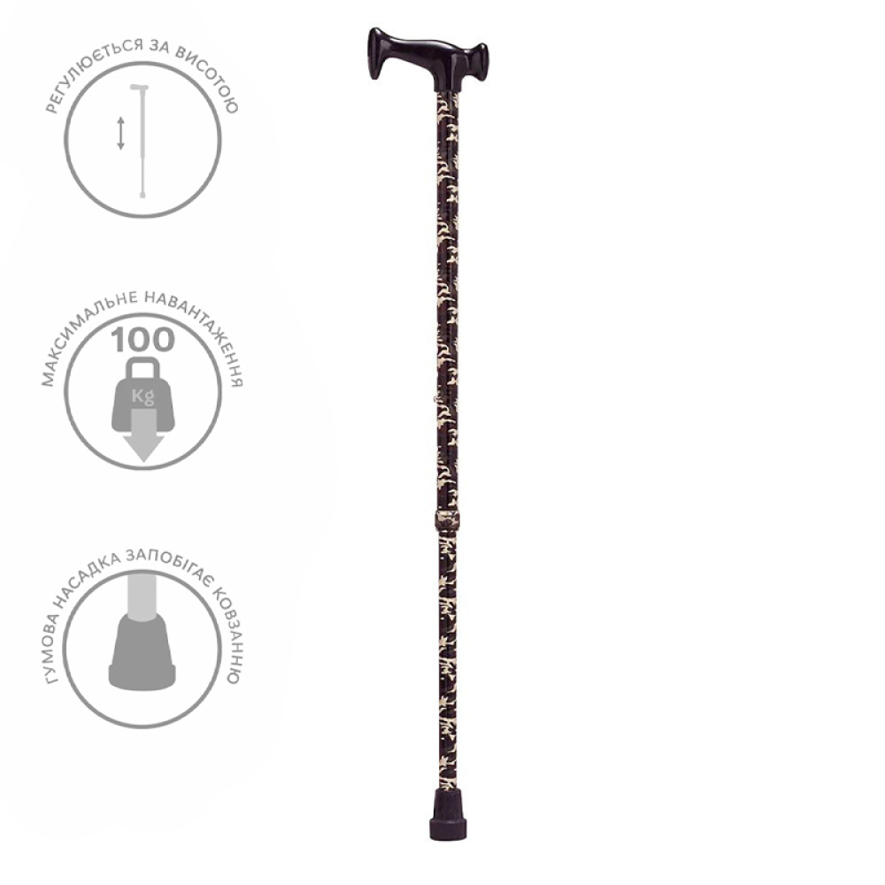 Палицю Ridni Опора KJT919D із зеленим візерунком виконано з легкого металу алюмінію. Є індивідуальним засобом реабілітації та пересування в разі порушень функцій нижніх кінцівок для: