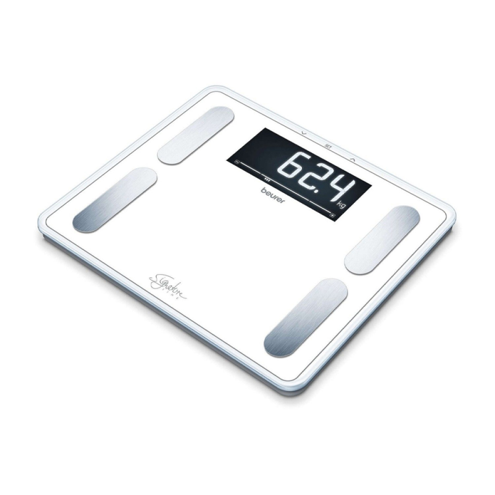 Діагностичні ваги Beurer BF 410 Line white поєднують професійний аналіз складу тіла з дуже великою зручною платформою та XXL-дисплеєм із підсвічуванням. Модель розрахована на користувачів, яким важливо контролювати не тільки вагу, а й відсоток жиру, води, м’язової та кісткової маси, а також калорійність основного й активного обміну.