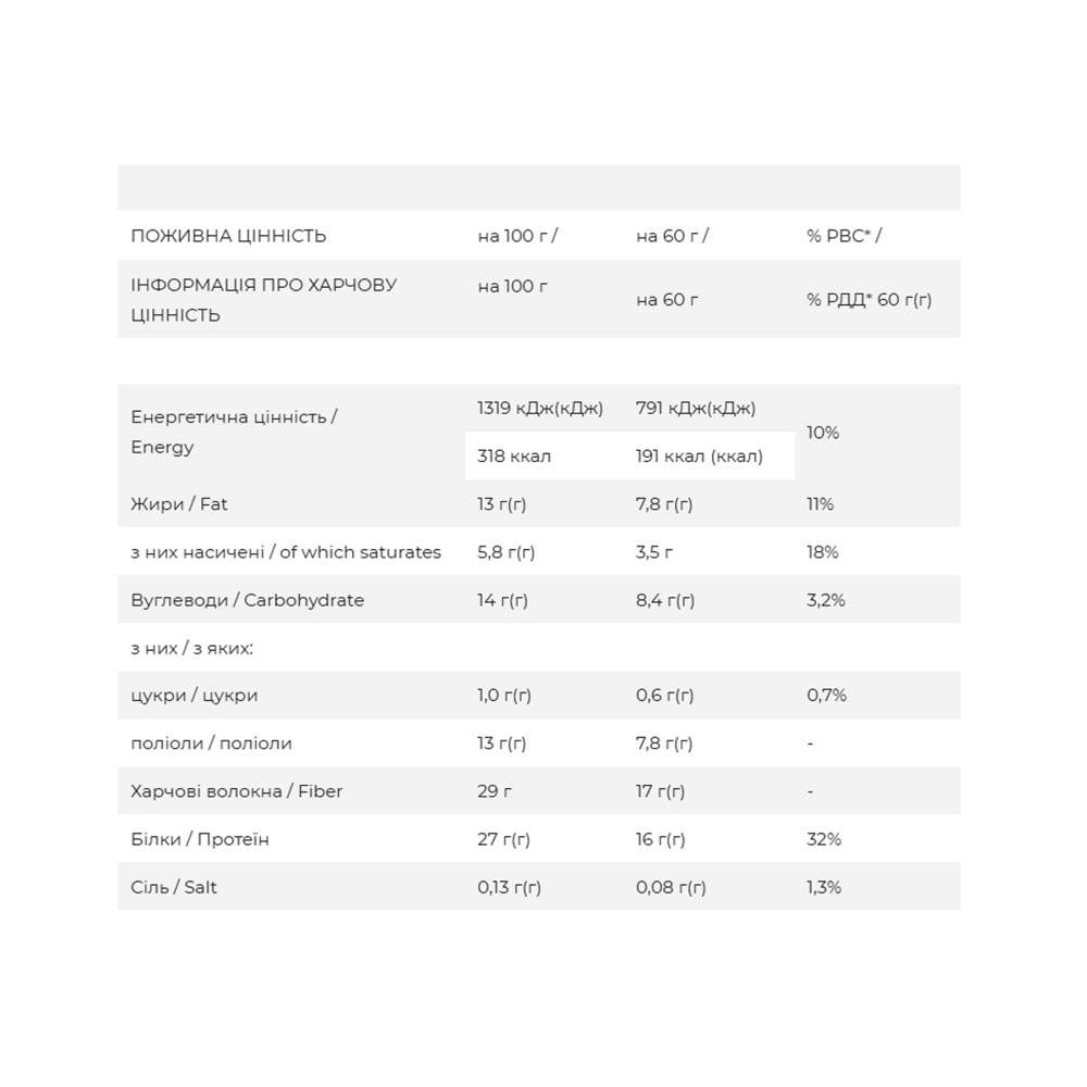 Склад: суміш рослинних білків 27% (ізолят соєвого білка, ізолят горохового білка, концентрат рисового білка), харчові волокна (ізомальтоолігосахариди, розчинна кукурудзяна клітковина), глазур з підсолоджувачами 17% (харчові волокна [полідекстроза], какао-масло, підсолоджувачі [мальтит, стевіол-глікозиди зі стевії], какао-порошок, емульгатор: соєвий лецитин, натуральний ароматизатор), кокосова олія, підсолоджувачі (мальтит, стевіол-глікозиди зі стевії), малиново-карамельний шар 16% (харчові волокна [ізомальтоолігосахариди]), яблучне пюре, підсолоджувач: мальтит, концентрат малинового соку 1%, кукурудзяний крохмаль, регулятор кислотності: лимонна кислота, натуральний ароматизатор), фісташки 3%, зволожувач: рослинний гліцерин, емульгатор: соєвий лецитин, натуральний ароматизатор, натуральний харчовий барвник: мідно-хлорофілний комплекс, морська сіль, антиоксидант: вітамін Е (токоферолу ацетат). Може містити сліди арахісу, молока.
