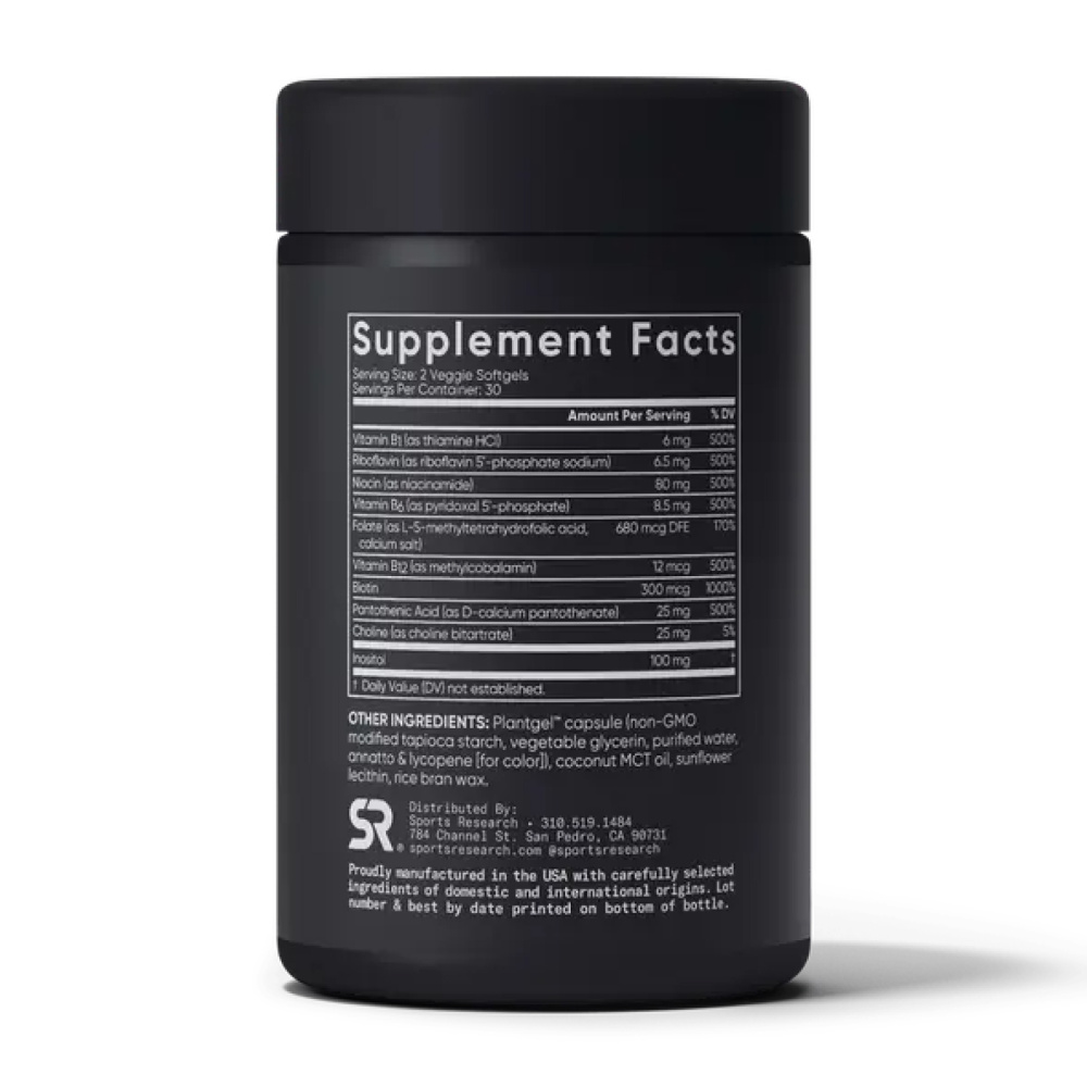 Sports Research® Vitamin B Complex містить усі 8 вітамінів групи B, включаючи оптимальні форми біотину, B12 і фолієвої кислоти, для зручного способу отримати повний спектр клітинної та нервової підтримки, а також поживні речовини для підтримки різних метаболічних процесів. Доставляється в Капсула Plantgel™, сертифікована для веганів і не містить ГМО, не містить хімікатів і наповнювачів, її щоденна підтримка, якій ви можете довіряти, щоб досягти своїх цілей оздоровлення.
