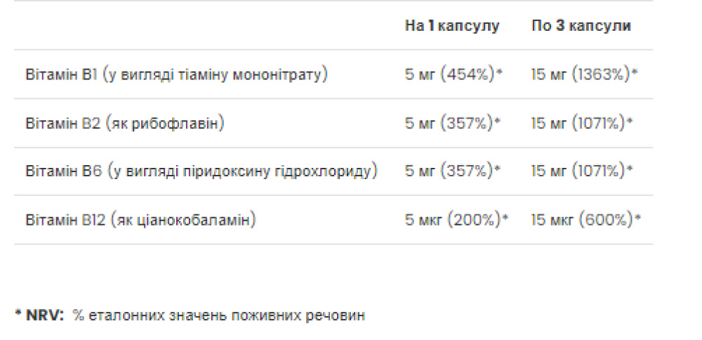Вітамін B1 (тіамін мононітрат), Вітамін B2 (Рібофлавін), Вітамін B6 (гідрохлорид піридоксину), Вітамін B 12 (ціанокобаламін) відносяться до групи Вітамінів B. Вони є незамінними водорозчинними вітамінами, що беруть участь у метаболічній діяльності. Організм людини не може виготовляти їх самостійно, тому комплекс Вітамінів групи B необхідно приймати додатково. Особливість Вітамінів групи B у тому, що це водорозчинні вітаміни, що робить їх швидко засвоюваними, їх легко включити у повсякденний раціон, а це важливо за нашого стресового способу життя, тиску на роботі та неправильного харчування. Вітаміни групи B підтримують роботу серця, нервової та травної системи, покращують стан шкіри. Вони також беруть участь у процесах метаболізму та зміцнюють наш організм у цілому.