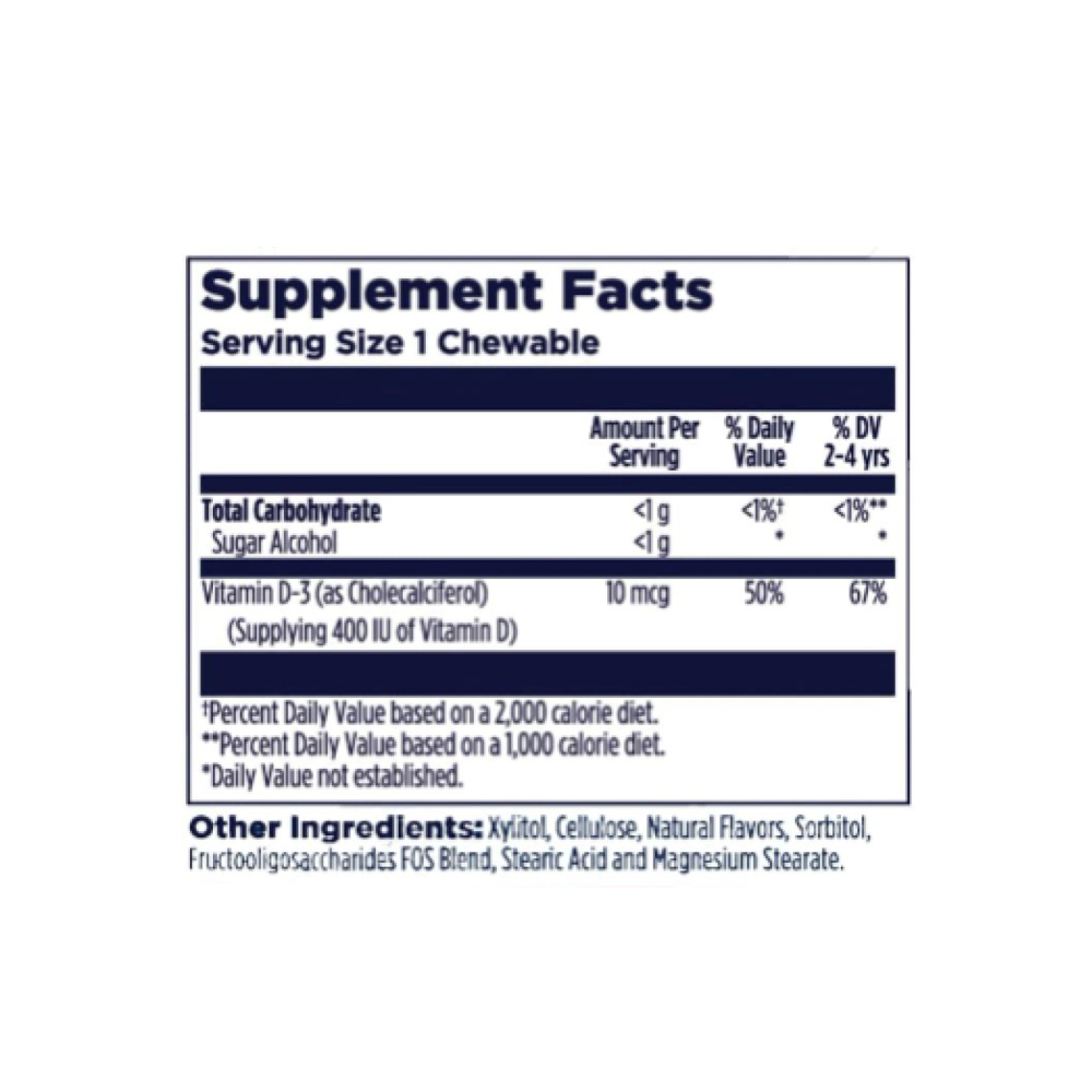 Вітамін D для дітей для зміцнення кісток. Забезпечте своїм дітям необхідну міцну підтримку кісток за допомогою 10 мкг (400 МО або 50% ДВ) вітаміну D3 у кожній жувальній добавці.