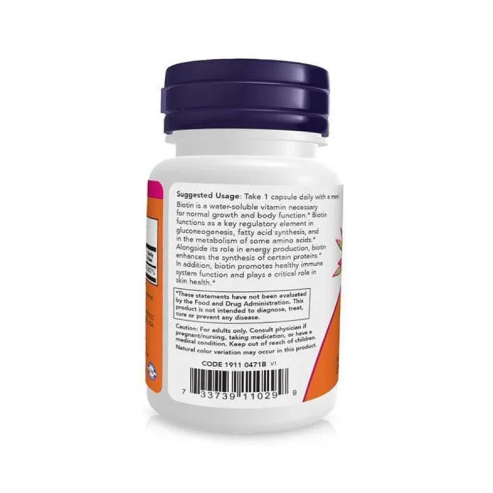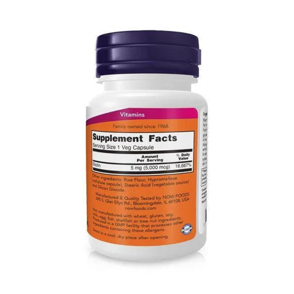 NOW Біотин 5000 мкг — це високоефективна добавка, яка забезпечує організм вітаміном B7 (біотин), що підтримує здоров’я шкіри, волосся, нігтів і сприяє нормальному енергетичному обміну. Біотин також важливий для роботи нервової системи та метаболізму жирів, вуглеводів і амінокислот.
